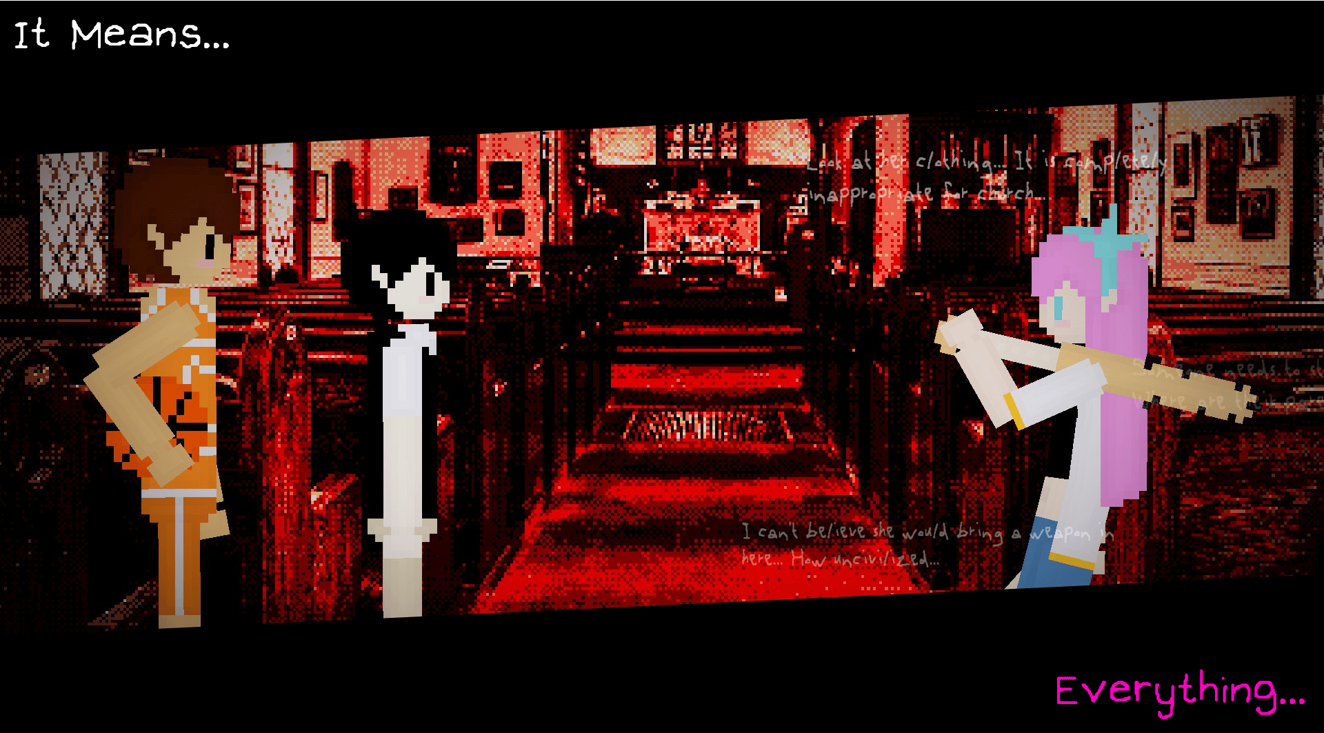 >>559381125I had an entire thing to say about this specific walking segment, but it all got deleted because of an accidental tab close and now my brain can't string it back together as good because I'm tired.Headspace is meant to come across as this cohesive world, but as you walk up these stairs it ends up breaking that as you see Headspace from an angle it was never meant to be seen. You pass through some Black Space rooms, Deeper Well, and finally Headspace. All these locations are just layered on top of each other. It's creepy seeing the world from an out of bounds perspective.>>559381125This route has some great murder for the soul moments. Playing Forever still has the duet leitmotif in it.