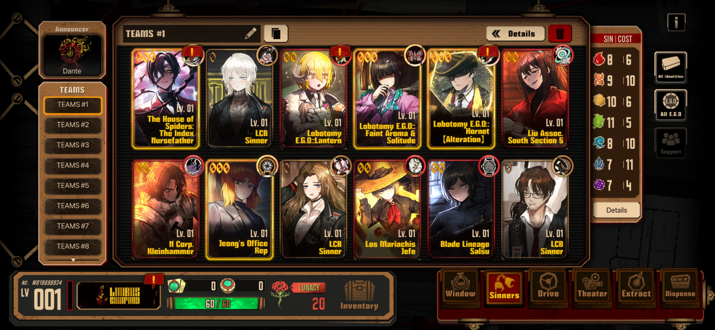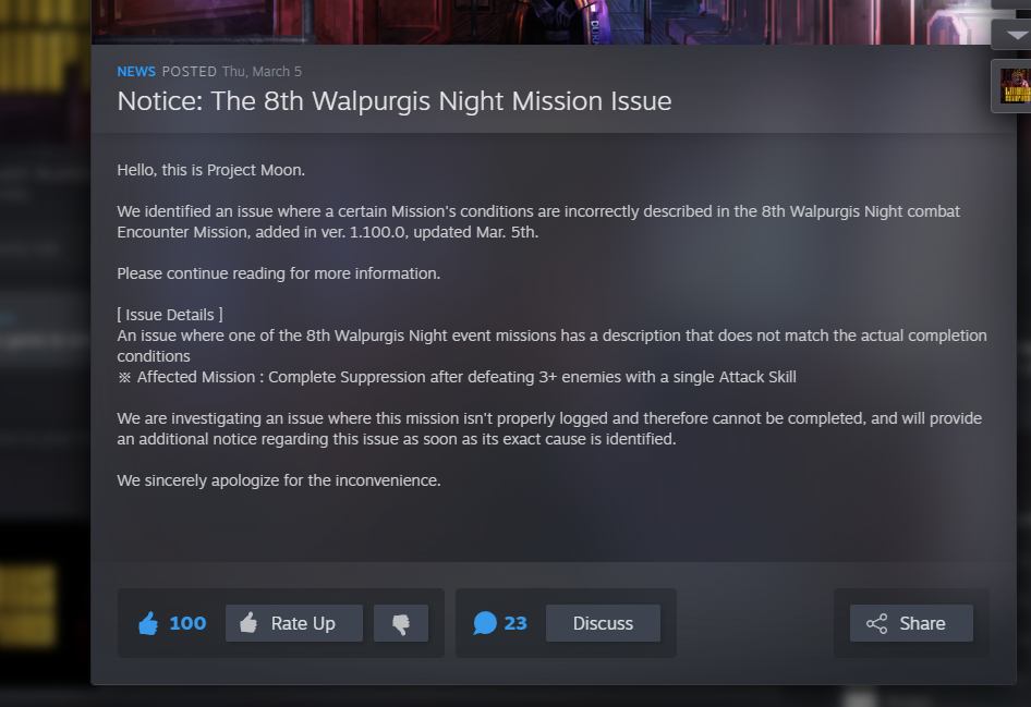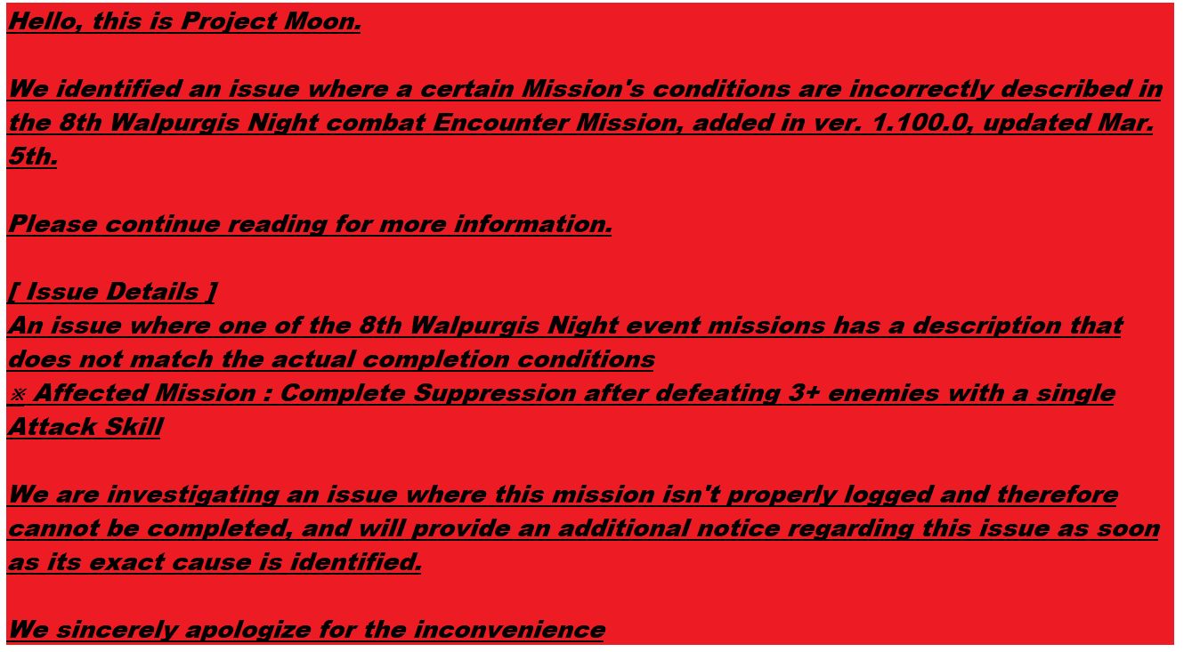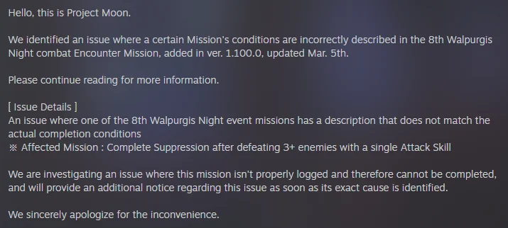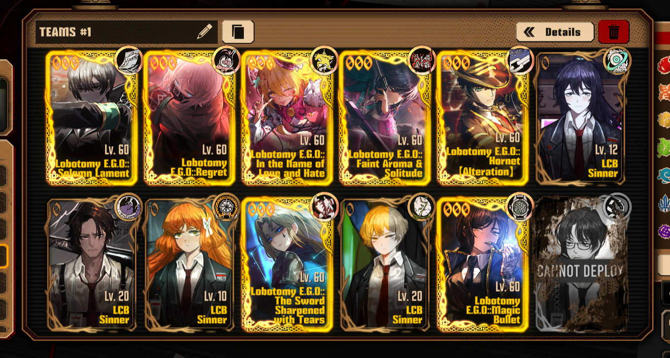Previous thread: >>559365525Season 7 - Kumo no Ito2025.12.31 — Mirror Dungeon #7 - Mirror of Names and Spiders2026.02.19 —Refraction Railway Line 5 - Merry Go Round2025.02.20 —>Current EventsThe 8th Walpurgis Night - The Dusk of Amber2026.03.05 — 2026.03.193rd Anniversary Event2026. 2. 26 12:00 — 2026. 3. 26 10:00 (KST)>Current Extractions2026.03.05 — 2026.03.19[000] Lobotomy E.G.O::Hornet [Alteration] Meursault[000] Lobotomy E.G.O::Faint Aroma & Solitude Ryoshu[HE] Harmony Sinclair2026.03.05 — 2026.03.19Target Extraction: [ The 3rd & 4th Walpurgis Night BokGak ]>FAQs! This game is directly tied to the setting of Project Moon's previous games, Lobotomy Corporation and Library of Ruina, and is set after both. Expect spoilers for those games in this thread.! The tutorial is important.>Download linksAppStore: https://apps.apple.com/app/limbus-company/id6444112366Google Play: https://play.google.com/store/apps/details?id=com.ProjectMoon.LimbusCompanySteam: https://store.steampowered.com/app/1973530/Limbus_Company/>Other linksOfficial twitter: https://twitter.com/limbuscompany_bOfficial youtube: https://www.youtube.com/@ProjectMoonOfficialOfficial site: https://limbuscompany.global>Required readinghttps://mega.nz/folder/xosDkZ5Z#Wt4JpUt5Bb2XG77pxuuXpw>For all your EGO and Sinner info needshttps://limbus.kusoge.xyz/https://gll-fun.com/en/>Useful resources and a general guidehttps://rentry.org/lcg_resourceshttps://rentry.org/lcbguidehttps://rentry.org/LCB_optimal_grind_guidehttps://lcb-days-since-last-id.carrd.co/https://lcb-days-since-last-ego.carrd.co/>Countdownhttps://lcbcountdown.carrd.co/3rd Anniversary Animationhttps://youtu.be/NtvbDGnRT-g?