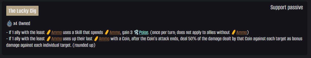 >>559376895she starts with 6 ammo, can't go above 6s1 spends 2 ammos2 spends 1 ammoif an ally staggers or hits an enemy at -40 SP then she will use another s1 afterwardswhen all out of ammo she will use her S1-2 then reload.