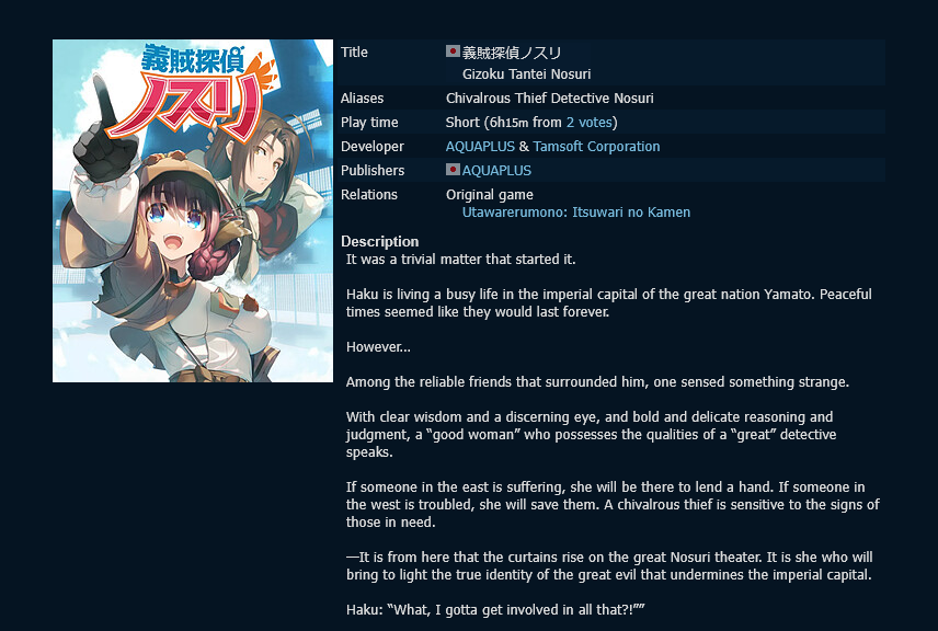 Visual Novel General #7468This general is for the discussion of English-translated Japanese visual novels.All posting of untranslated visual novels belongs on >>>/jp/E-celeb shitposting is not allowed.Kindly use spoiler tags appropriately when discussing plot spoilers to facilitate smooth discussion.>Having trouble with your VN? Try the following before you ask for tech support:1. Be in Japanese locale2. Read the Readme3. Check https://rentry.org/4chan-vn-help4. Copy error messages with CTRL+C and paste them with CTRL+V into DeepL5. Google it>FAQs, Recommendations, and Other Useful Things:https://chartanon.github.io/moechart/https://files.catbox.moe/j3dd0n.pnghttps://github.com/marisukukise/japReader>Need a novel with a specific element?https://vndb.org/g>Download Links:https://rentry.org/4chan-vn-linksPrevious thread: >>559343151