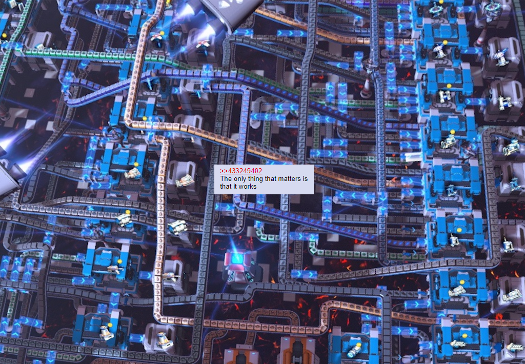 >>559467930I'm starting to think I am doing something wrong becasue I really struggle to find any loops like pic rel but in Satisfactory and there isn;t a single blue print with something like this.
