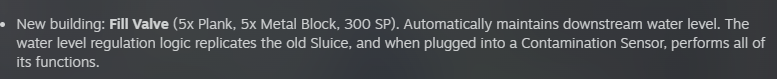 >>559542321Upcoming automation stuff had the sluice gate broken apart into the valve (aka sluice sans logic), contamination sensor, and a water depth sensor.You essentially had to build the logic controlling it, which in the past was built-in. One of the big draws of the sluice gate was it's compactness, needing external logic kills it.