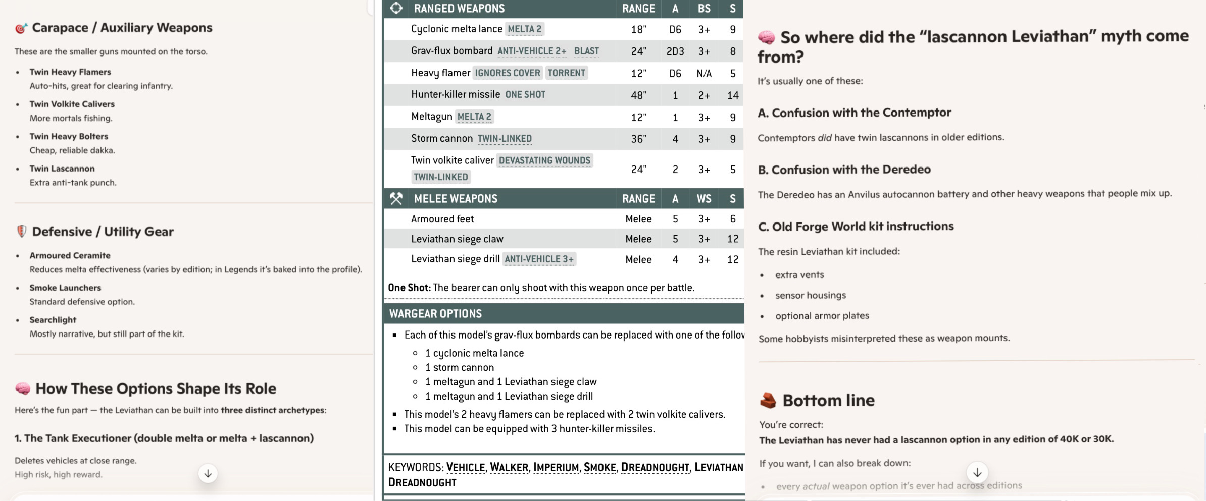 >>559527929I get why people trust AI to know everything. For the average user who has no clue how it actually works, it’s just this super-smart oracle that holds all knowledge. My dad from that story is a perfect example—he asks it stuff constantly, and 90% of the time it’s spot-on, or at worst just a little outdated. That builds a mental shortcut: “Need to know something? Ask the AI.” But then they get burned with stale info or straight-up hallucinations.Picrel: Me asking what weapons a Leviathan Dreadnought can equip in Warhammer, vs. its actual stat card. Oh, and it saying it’s a common myth amongst players that the leviathan has weapons it’s never had. It calling those options “cheap” is also flat-out wrong the current edition doesn’t charge points for weapons anymore.