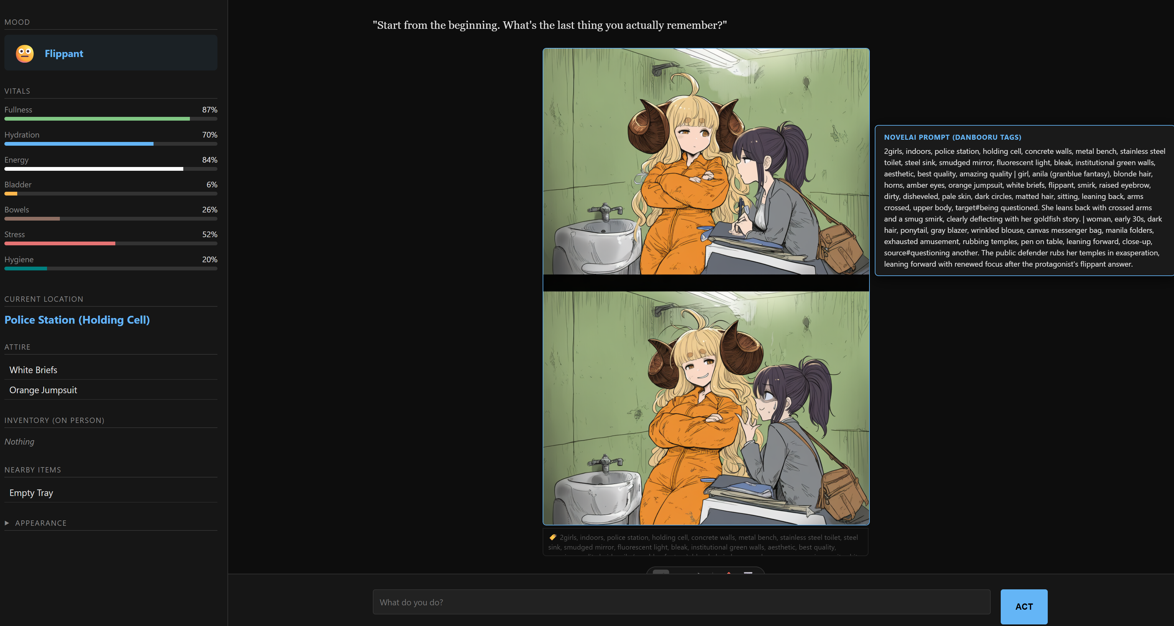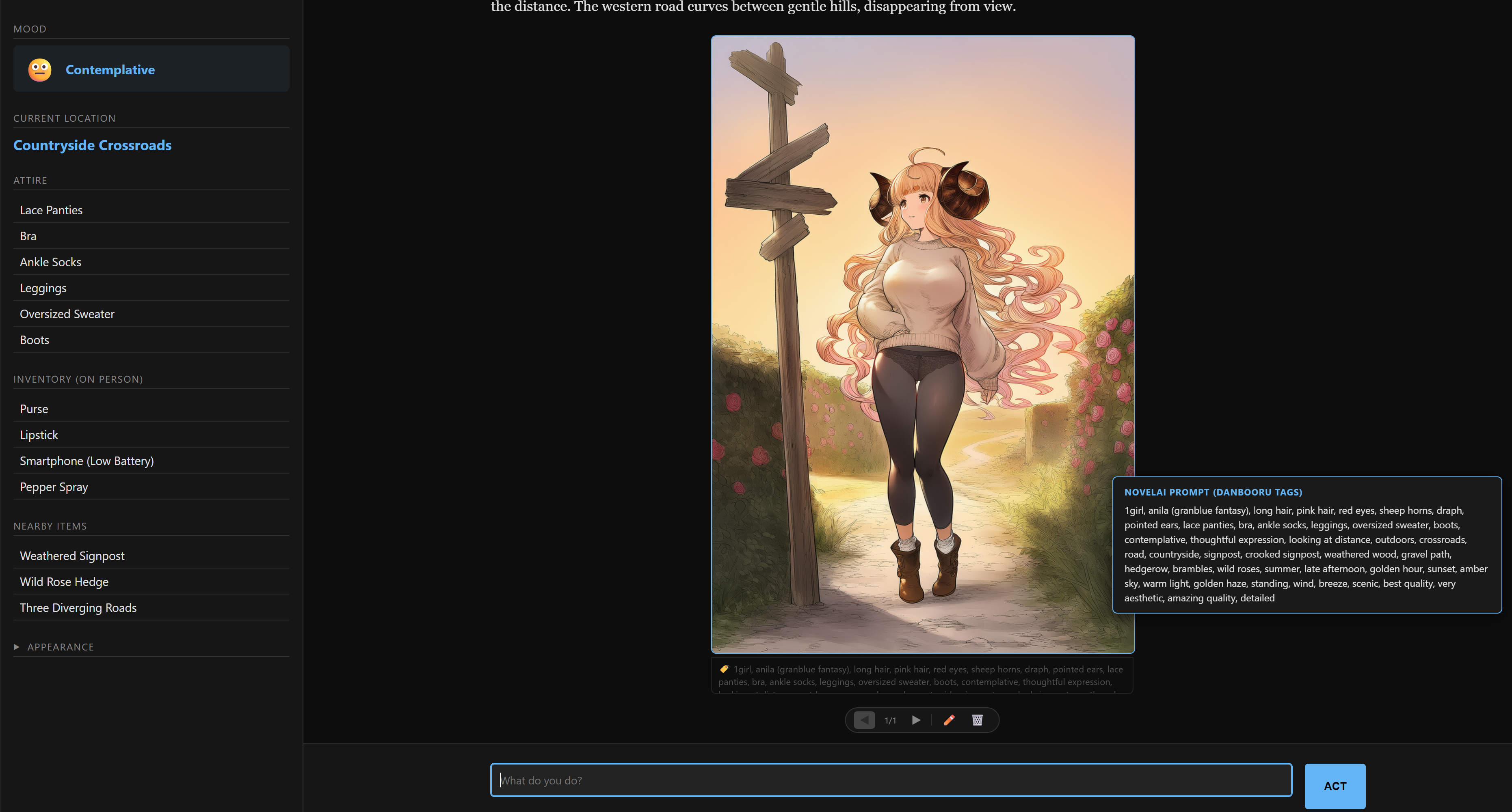 Done some more tinkering with the text adventure + NAI image gen if folks are interestedhttps://files.catbox.moe/sahddd.htmlMostly QoL stuff. Should shit itself less about JSON, allow image tag editing, and have a nonhardcore mode now that allows editing, as well as both an RPG and a freeform mode without any of the meter stuff (but still inventory, mood, etc. since that's helpful for the image gen)After doing some more playing around I think GLM 5 is the best model for the text and tag conversion, but right now Fireworks is the only provider that offers it that's worth a shit, and you need to use BYOK and provide an API key for it since its getting demolished by Openclaw right now, so OpenRouter gets rate limited hard. The older Kimi instructs (0905 in particular) are a good second option