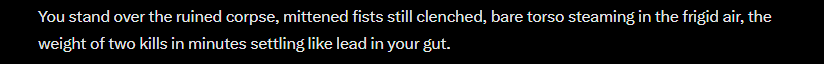 >>560253017I rarely dip my toes in it, and it's usually convoluted non-fatal stuff because it's more fun to see it through a living person's eyesBut anyway, my advice would be to put a [Content Warning: Character Death, Guro, Graphic Violence, Dismemberment, Snuff, Necrophilia, (etc, etc)] in your memory