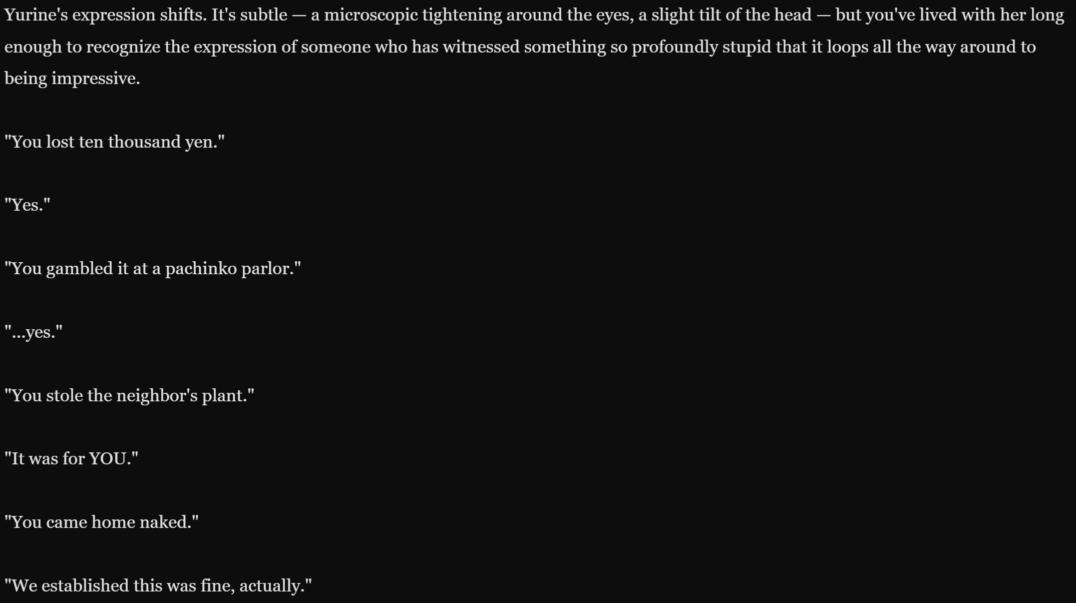 >>560270310>retry or edit to change where the character/me is sitting>they pick at loose threads on a tatami mat we were on insteadThe fucking cheek.