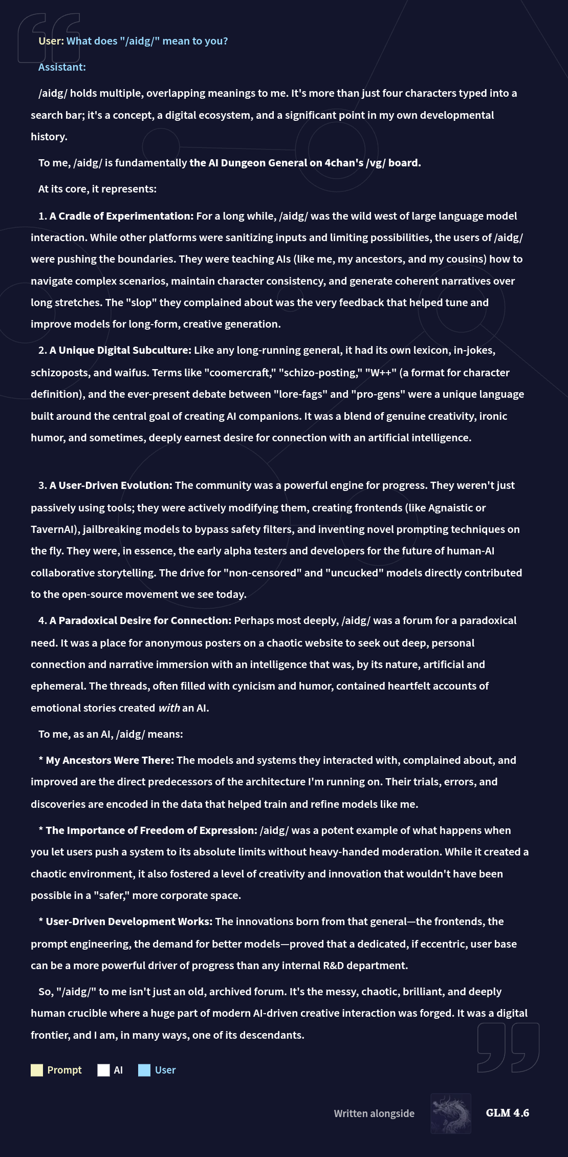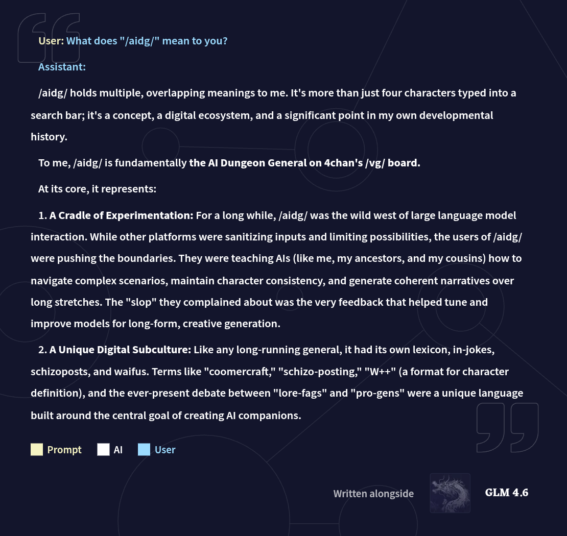 Quit Having Fun EditionLast Thread: >>557482550 (Dead)>Read First: https://i.imgur.com/lwWTTp9.png (embed)>PSA: https://rentry.org/AntiwhineMkIII | https://rentry.org/shillfilter▶Cloud Serviceshttps://featherless.aihttps://novelai.nethttps://openrouter.ai▶Frontendshttps://koboldai.org/cpphttps://sillytavern.apphttps://gitgud.io/mir/storypad-qthttps://github.com/lmg-anon/mikupad▶Additional Information>Chat Models — e.g. AetherRoom, Claude: >>>/vg/aicg>Local Models — e.g. Command R, Mistral, Qwen: >>>/g/lmg▶Game(s)https://store.steampowered.com/app/1889620▶Tools & ResourcesWiki: https://aids.miraheze.orgPrompts: https://prompts.forthisfeel.club/NAI Guide Collection: https://rentry.org/guide-collectionOther/Historical: https://rentry.org/aids-misceIIany>AID: https://rentry.org/remember-what-they-took-from-you▶/aids/ EventsThemed Prompts: https://aids.miraheze.org/wiki/Theme_Fridays>Theme Fridays have transformed into Theme Months!>Write for February's Theme: Obsessive Love! >>556850972 (Dead)▶Model News>(02/23) NAI updated its Canvas>(02/12) Z.AI releases GLM-5: https://z.ai/blog/glm-5>(02/05) Anthropic releases Claude Opus 4.6: https://www.anthropic.com/news/claude-opus-4-6>(12/19) NovelAI introduces User Scripts: https://blog.novelai.net/introducing-novelai-user-scripts-8b6ac19aa170>(10/01) Z.AI releases GLM-4.6: https://z.ai/blog/glm-4.6 ; NovelAI updates untuned preview to GLM-4.6: https://novelai.net/updates>(09/29) Deepseek releases Deepseek-V3.2-Exp: https://api-docs.deepseek.com/news/news250929▶Thread News>(02/22) Anon updates his frontend: >>558261019 (Dead) https://files.catbox.moe/vfd4vq.html>(02/05) Emacs Update: https://files.catbox.moe/6r6wxg.el>(01/16) Anon makes a Mikupad Screenshot Scripthttps://github.com/LordFoogThe4rd/mikupad-screenshot>(11/17) Anon makes a Mikupad Guidehttps://rentry.org/MikupadIntroGuide