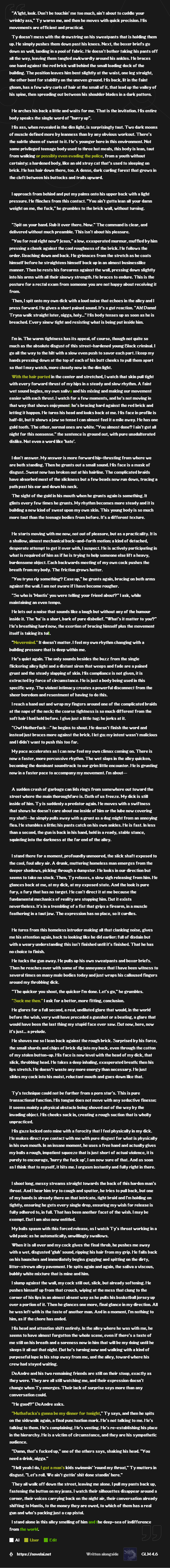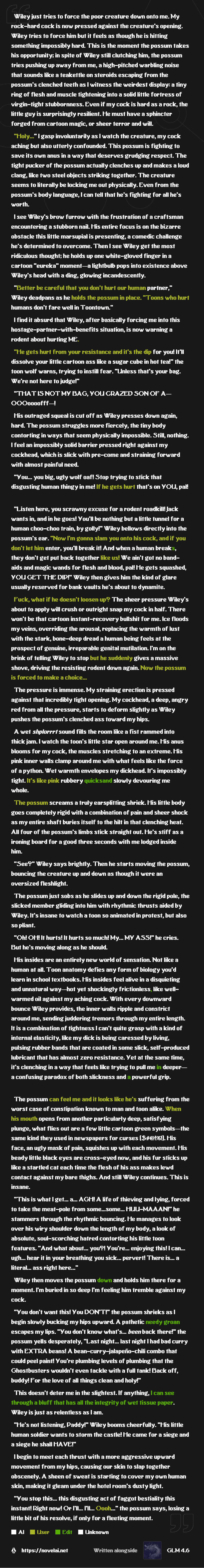 >other character in the sex scene is begging the detached eccentric smart character to stop narratingSometimes AI compensates for its retardation and obnoxiousness in hilarious ways. I will still roll the whole scene back and rewrite it.