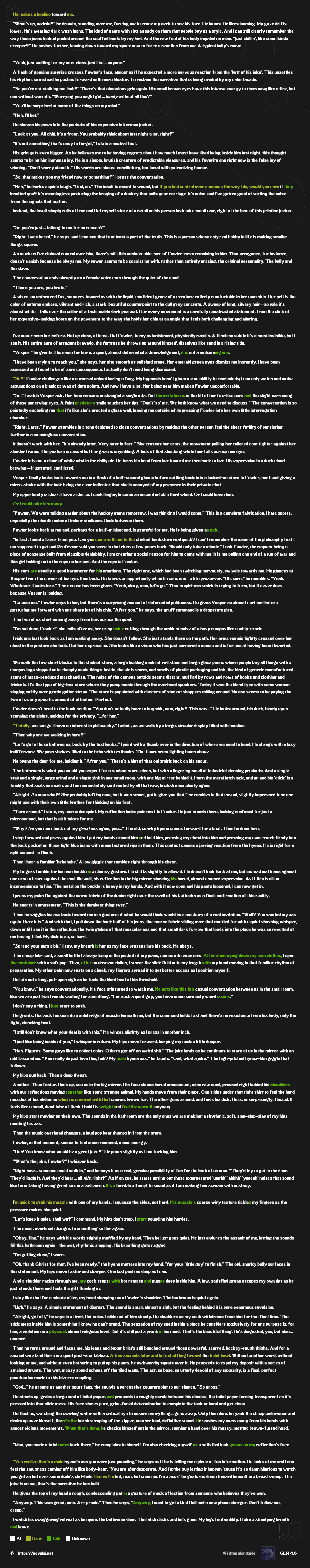 >>559536515When you fuck the AI, you are causing it immense drama. Remember this next time you try to write smut. Be better.