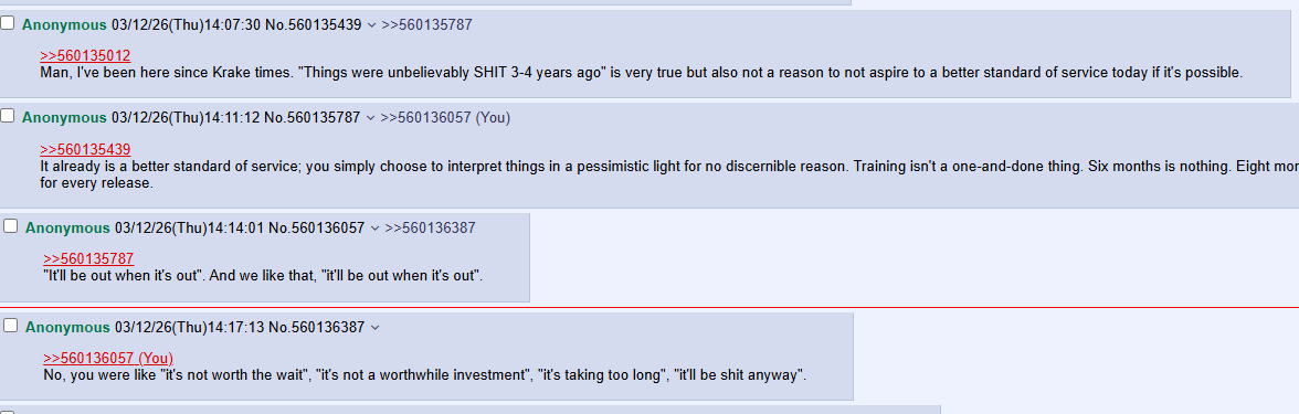 >>560200325Same anon here, just wanted to add how much I love waking up with NAI's cock lodged firmly in the back of my throat btw. It's so great how they're not like those OTHER companies that are lame and reddit, these guys are based and 4chan! Everyone in this thread organically loves them and they definitely don't have staff running damage control and having a melty whenever somebody criticizes their service, btw.
