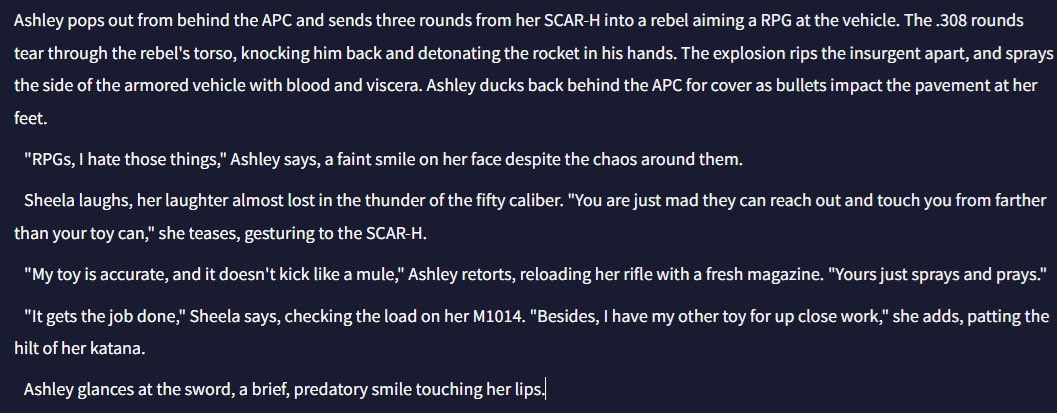 >>559553880I'm running the story setup through every model I can find just to see what I like the most.Gemini, Grok, Shitgpt, AIDungeon, DeepSeek.Gemini and Grok are the most useful so far. Grok seems at about the same level as Gemini but allowing edits more than just the previous prompt is more convenient than being locked into a thread like Gemini does >>559554535Its just a scene about a sci-fi portal opening up in the middle of a college auditorium and everyone nearby but the protagonist gets shredded by the portal while the protag gets sent into a hellworld through a hell realm.Shitgpt can't even handle a basic bitch hellraiser scene