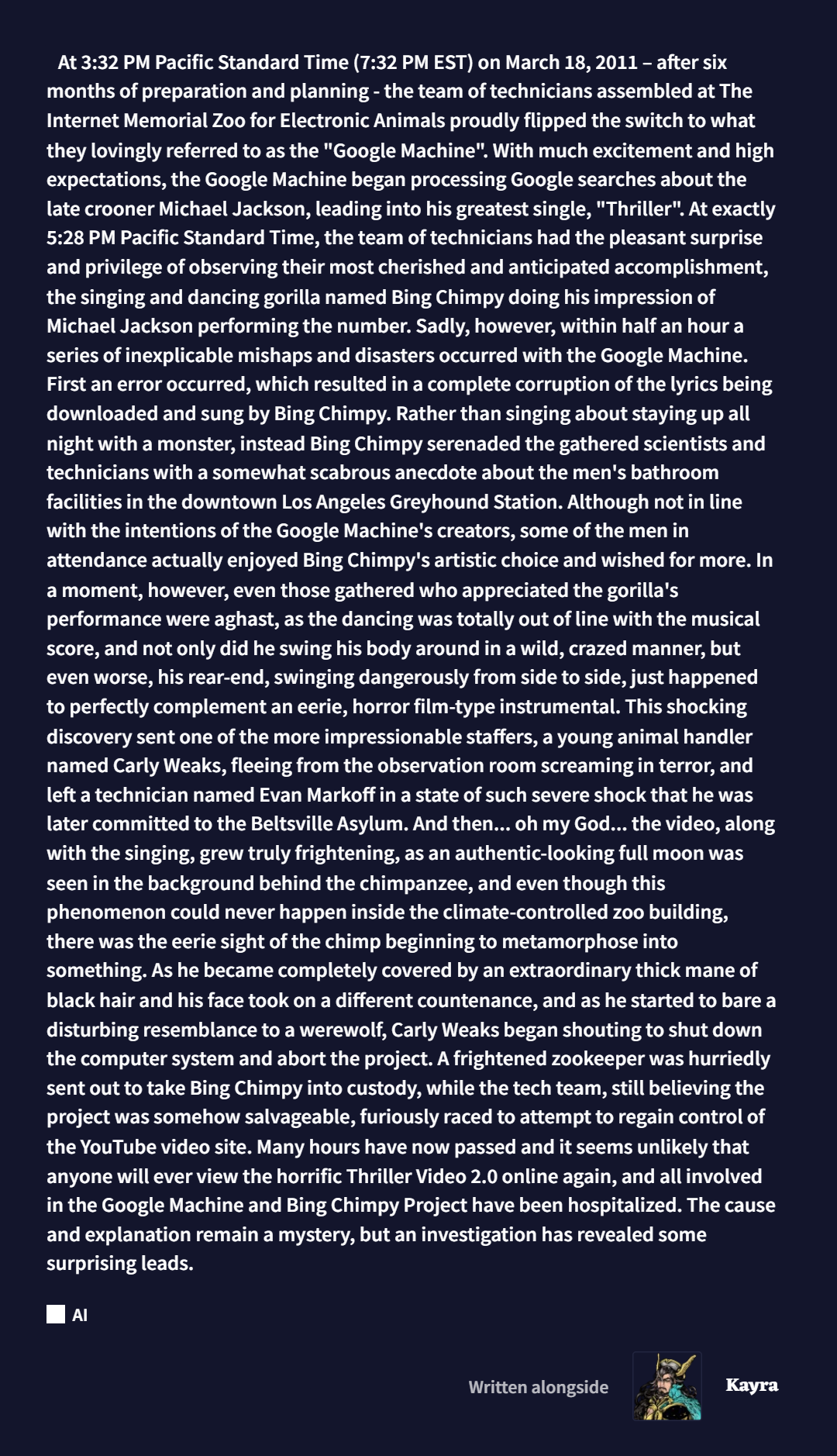 >>560275721I'd forgotten all about that one. The quality of our writing was abhorrent back then, but the memories... It's been 4 years, brothers.