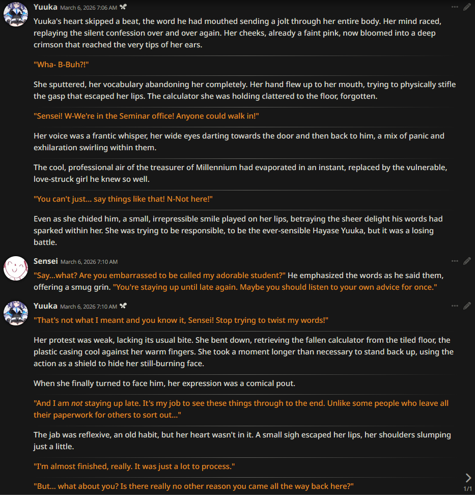 /aicg/ - A general dedicated to the discussion and development of AI chatbots#734 - Nozomi X Eli Edition▶https://rentry.org/aicg_vg_memo▶This general is for discussion of the interactive experiences you can build on top of AI chatbots.>NewsGemini 3.1 Pro https://deepmind.google/models/model-cards/gemini-3-1-pro/Claude Sonnet 4.6 https://www.anthropic.com/news/claude-sonnet-4-6GLM 5 https://z.ai/blog/glm-5Claude Opus 4.6 (1M context) https://www.anthropic.com/news/claude-opus-4-6additional info: https://aicg.neocities.org/info>FrontendsSillyTavern: https://docs.sillytavern.appRisuAI: https://risuai.netAgnai: https://agnai.chat | https://rentry.org/agnai_guides_>Botshttps://characterhub.org | https://chub.aihttps://realm.risuai.nethttps://partyintheanchorhold.neocities.orghttps://aicg.neocities.org/bots>Modelsjailbreaks: https://rentry.org/jb-listinggpt: https://platform.openai.com/playground | https://platform.openai.com/docsclaude: https://console.anthropic.com | https://docs.anthropic.com | https://rentry.org/how2claudegemini: https://gemini.google.com | https://ai.google.dev/docs | https://rentry.org/gemini-qrdeepseek: https://chat.deepseek.com | https://api-docs.deepseek.comlocal: >>>/g/lmg | https://aicg.neocities.org/local | https://openrouter.ai>Botmakinghttps://aicg.neocities.org/botmakinghttps://desune.moe/aicharedhttps://agnai.chat/editor>MetaOP templates: https://rentry.org/vgOP | https://rentry.org/aicgOPaicg botmaking events: https://aicg.neocities.org/eventslore: https://rentry.org/aicg_chroniclesrice: https://aicg.neocities.org/ricingservices assessment: https://rentry.org/aicg_metalogs: https://sprites.neocities.org/l/r | https://chatlogs.neocities.orgprev: >>559384501