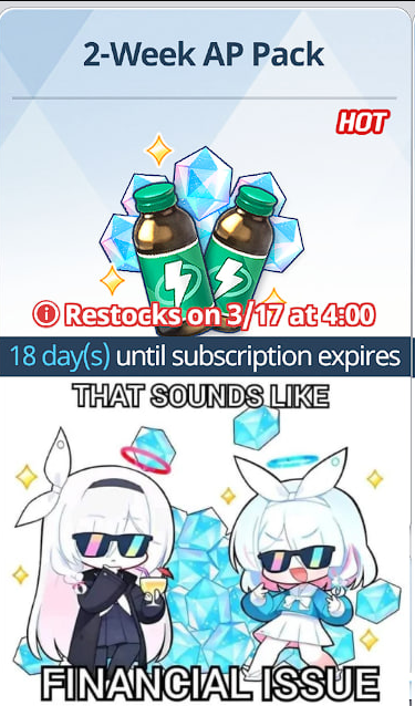 Previous Thread: >>559450942>Guides, Resources and useful links:https://rentry.org/bagguides>/bag/Circles/Clubs/Friends:https://rentry.org/holdingthebag>4koma, Manga, Side Content, PVs & Shortshttps://rentry.org/bacontent>>(JP) – JST>Banners:>3/4 After Maint – 3/18 10:59Koyuki (Pajamas)Yuuka (Pajamas)Noa (Pajamas)Fuuka (New Year – Limited)Haruna (New Year – Limited)>News:Patch notes: https://bluearchive.jp/news/newsJump/639>Events:Secret Midnight Party: The Chimes of Tag – 3/4 After Maint – 3/18 10:59>Content:Grand Assault: Hieronymus (Urban – Torment w/Heavy & Special Armor) – 3/4 After Maint – 3/11 3:59Limit Break Assault: The Fury of Set (Field – w/Special Armor) – 2/13 11:00 – 3/18 3:592x Lesson/Scrimmage – 3/4 4:00 – 3/11 3:592x Hard – 3/11 4:00 – 3/18 3:59>>(GLOBAL) – UTC>Banners:>3/3 2:00 – 3/10 1:59Hina (Swimsuit)Iori (Swimsuit)Mimori (Swimsuit)>News:Patch notes: https://forum.nexon.com/bluearchive-en/board_view?thread=3374459>Events:The Arius District's Emergency Class Mission – 2/3 2:00 – 3/10 1:59Balancing Schale's Books with the General Student Council – 3/3 2:00 – 3/10 18:59My Office: https://bluearchive.nexon.com/user/myoffice>Content:Grand Assault: ShiroKuro (Indoor – Torment w/Light & Elastic Armor) – 3/3 2:00 – 3/9 18:59Limit Break Assault: The Fury of Set (Field – w/Special Armor) – 2/11 2:00 – 3/9 18:592x Commissions – 3/2 19:00 – 3/9 18:592x Bounty – 3/9 19:00 – 3/16 18:592x Account EXP – 3/13 19:00 – 3/15 18:592x Commissions – 3/16 19:00 – 3/23 18:592x Account EXP – 3/20 19:00 – 3/22 18:592x Lesson/Scrimmage – 3/23 19:00 – 3/30 18:59