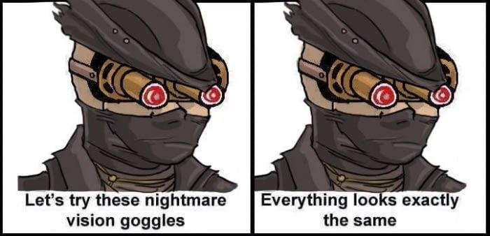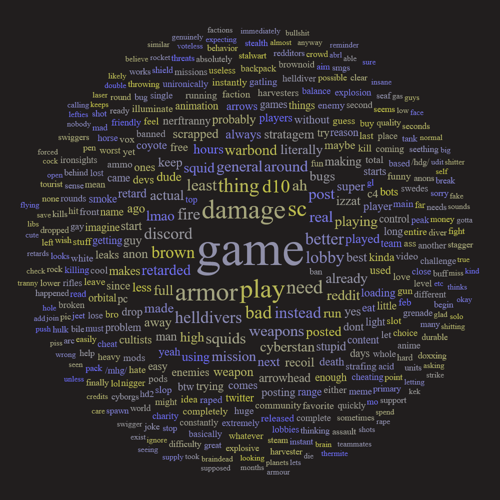 Unironically this. Me and my friend only play HD2 to shoot space bugs on biomes without visual AIDS or retarded handicaps, we don't give a single fuck about the jeet roleplay.