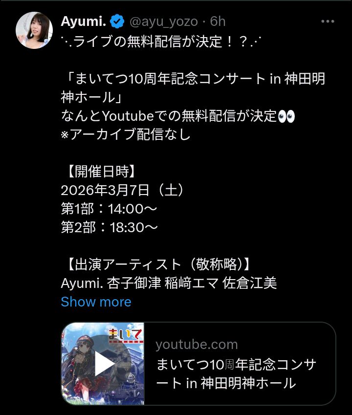 there will be a livestreamed concert for Maitetsu's 10th anniversary, it will ONLY be livestreamed and it will NOT be archived, starts in around 11 more hours for those interestedhttps://www.youtube.com/live/4_3Ut3UrgHE?si=fvHUcKZfvwIc7e2K