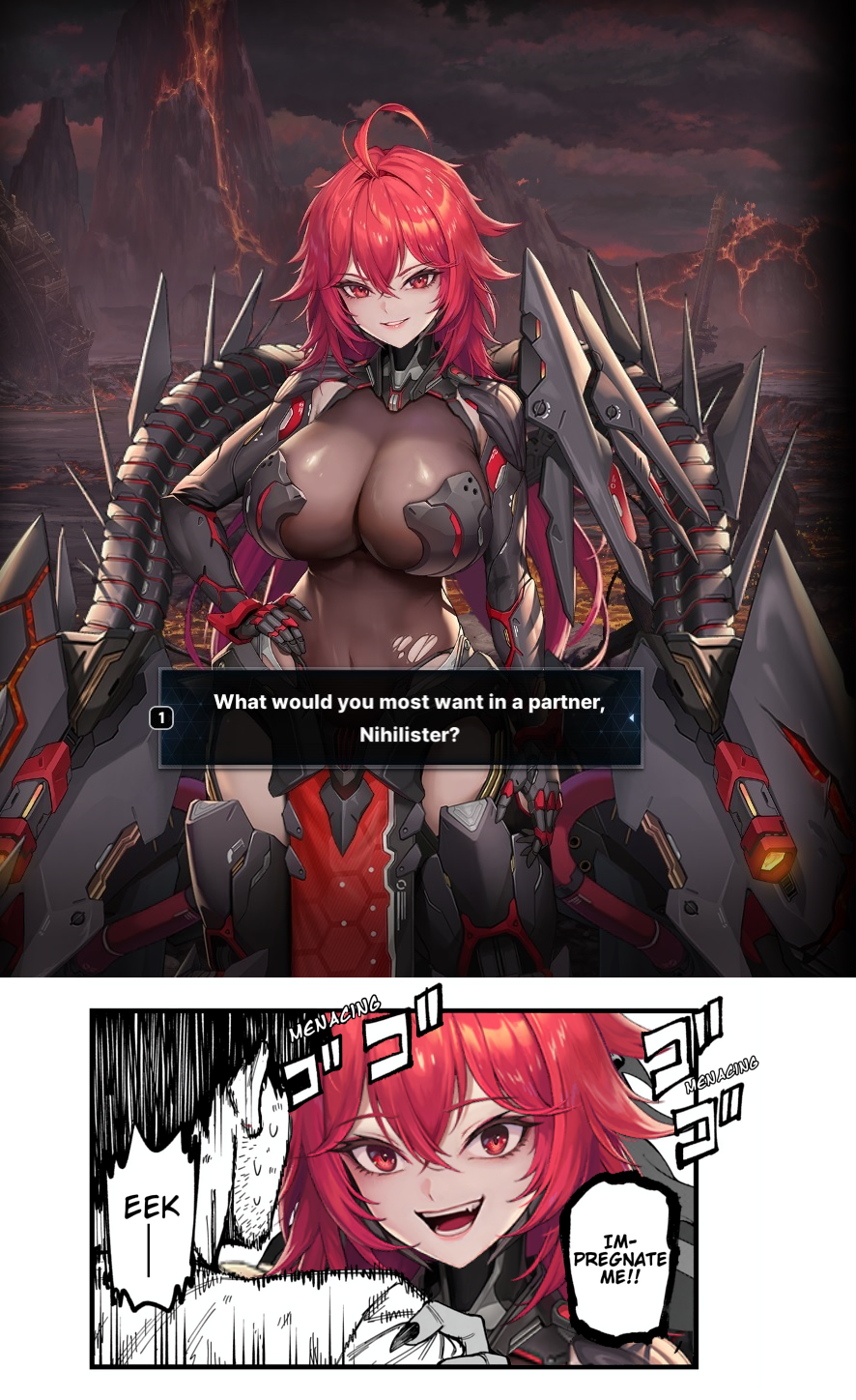 >>559538520>start the foreplay>triggers her flight or flight response (which is stuck on fight) and anger issues>amazon positions you (because 400lb cyborg)very probably