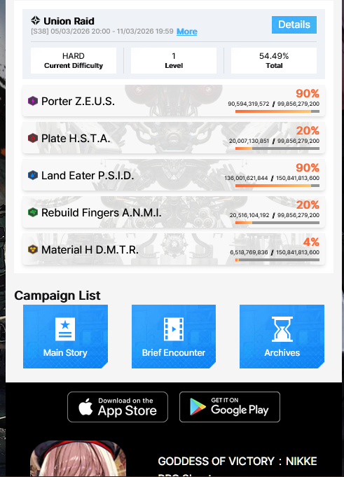 DO YOUR HITS EDITION https://nikg-chart.uk/>Game Download - Android/iOS/PChttps://nikke-en.com/index.html>General Info/FAQ for New Playershttps://rentry.org/NikkeInfo>Additional Linkshttps://rentry.org/nikghomeALL DATES/TIMES LISTED BELOW ARE UTC+9 (KOREA TIME)>Update on March 5https://nikke-en.com/newsdetail.html?content_id=273ffaa4a4cc8a4e10a91f9ae91c4bfbc5bd>Developer's Note: January 2025https://nikke-en.com/newsdetail.html?content_id=4e97e053a5501a40a3ab73ca13978b6f65da>Current EventsLycoris Recoil Collab - February 12 ~ March 12ENTER HEAVEN - March 5 ~ March 19Union Raid - March 6 ~ March 12>Upcoming EventsCo-Op: Storm Bringer - March 13 ~ March 15>Current Special RecruitsChisato Nishikigi - February 12 ~ March 12Takina Inoue - February 19 ~ March 12E.H. - March 5 ~ March 19>Upcoming Special RecruitsTBA>Current Costume PassesChisato Nishikigi: Red Spark Guitar [Mission Pass] - February 12 ~ March 12Takina Inoue: Blue Pulse Bass [Mission Pass] - February 19 ~ March 12Mast Romantic Maid: Tea Service [Costume Gacha] - February 12 ~ March 12Zwei: Spring Stroll [Mission Pass] - March 1 ~ March 31>Upcoming Costume PassesTBA>CodesMILLIONCOMMANDERS (04/30/2026)Previous: >>559484497