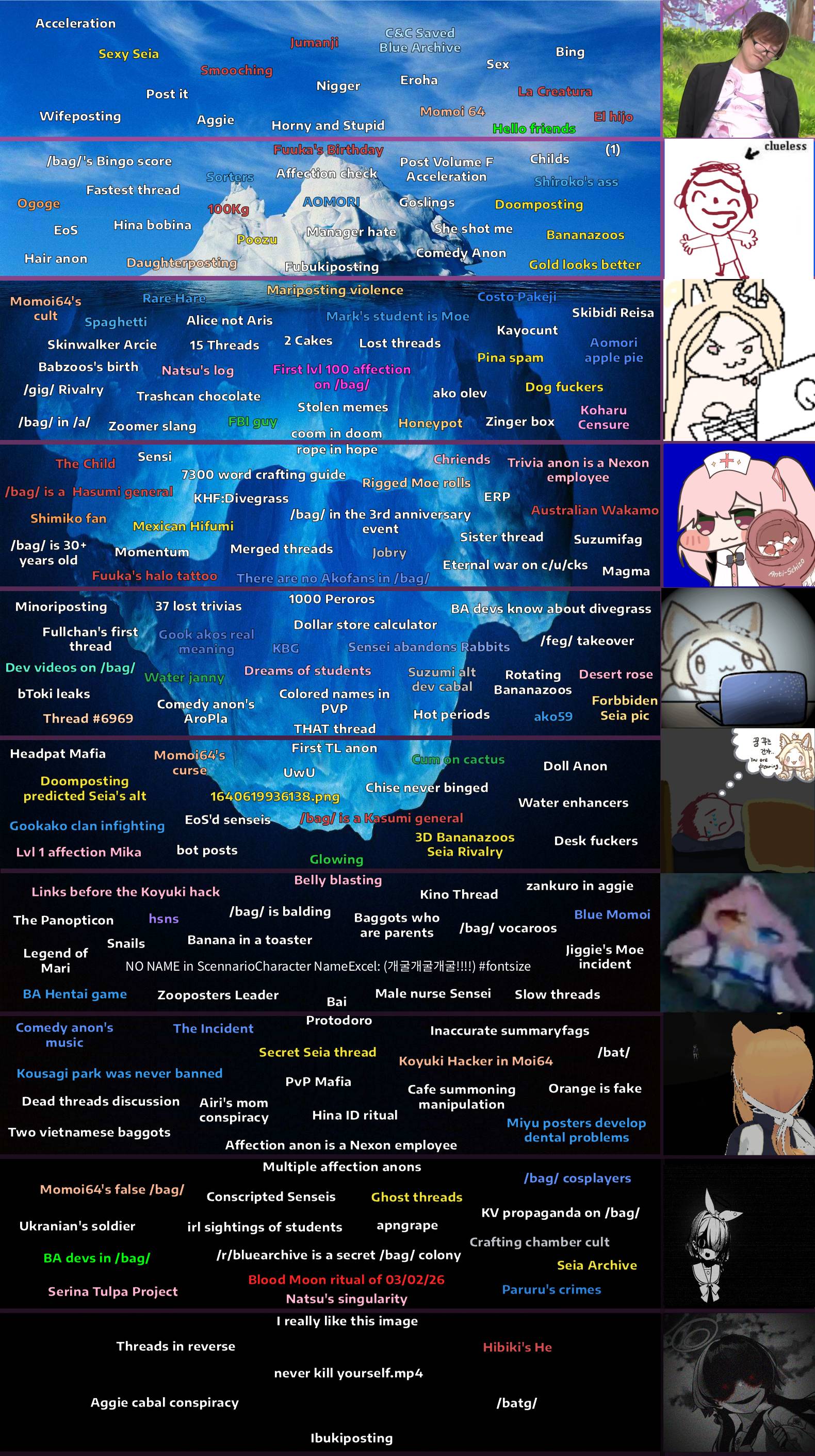 Iceberg anon here with an update on the /bag/ iceberg. Remember, this is an iceberg about the thread itself, not the game.A few small new entries but some of them are quite interesting. Like the videos with the dev mark on it that were circulating around /bag/ or the Koyuki hacker being in the session of Moi64.Then there was this funny "coincidence" of several anons EoS right during the blood moon, mainly moi64 devs, aggie anon and comedy anon. Very suspicious behavior if you ask me.I'm also thinking of shirking down a few entries to save some space. I started by mixing the Arona and the Plana entry for coemdy anon, but I can see a few others having a similar treatment in the future. Let me know what you think of these changes.As always, any suggestions and feedback is appreciated. 03/03/26 ChangelogAdded>Costco Pakeji>Dev videos on /bag/>Koyuki Hacker in Moi64>BA devs in /bag/>Blood Moon ritual of 03/02/26>Babzoos's birth>Hello friendsChanged >"Comedy anon's Plana" to "Comedy anon's AroPla"Removed>Comedy anon's Arona