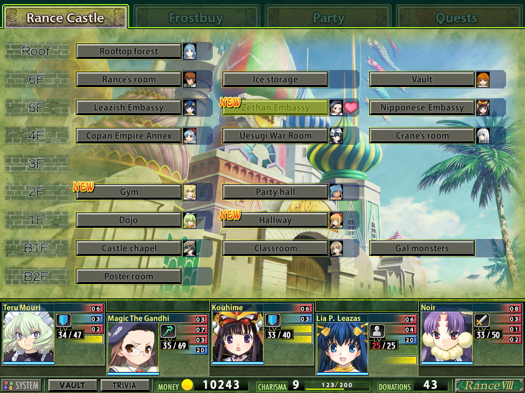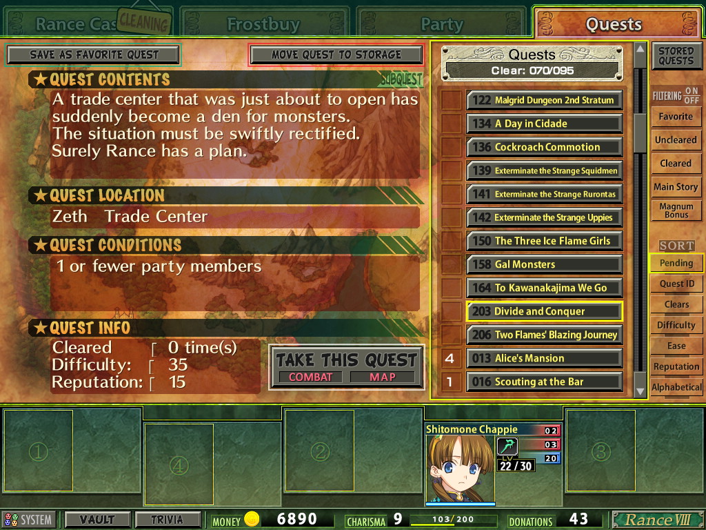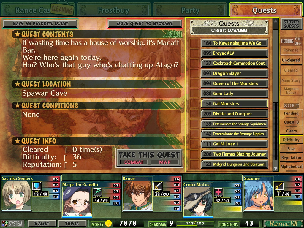 >>559584919oh that makes perfect sense if it's based on the encyclopedia.I've been messing around and figured out some basic modding for maps which is where I ran into it.Haven't figured out too many complex features, but I can do basic stuff like adding fights/chests/nodes/warps.I have not figured out how certain quests actually appear/trigger, how to change quest rewards, etc. For example, most of the start of turn events are listed as quests in the "quest data" table, as well as random events, which leads me to believe there's a way you should be able to turn things like the Egg events into something that doesn't waste multiple turns, or to make it so you get one of the miscellaneous Rance cards from the base event instead of a dupe of the lvl 42 version.Or the ultimate goal of creating a KTM (Kill the Miki) route where you can completely ignore the turn limit and focus on the war instead.