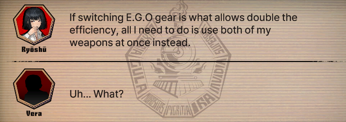 >>559619151She only gets EGO garbage for her duel wielding. Not 2 Aleph. Enjoy her Shard glove Beak EGO combo