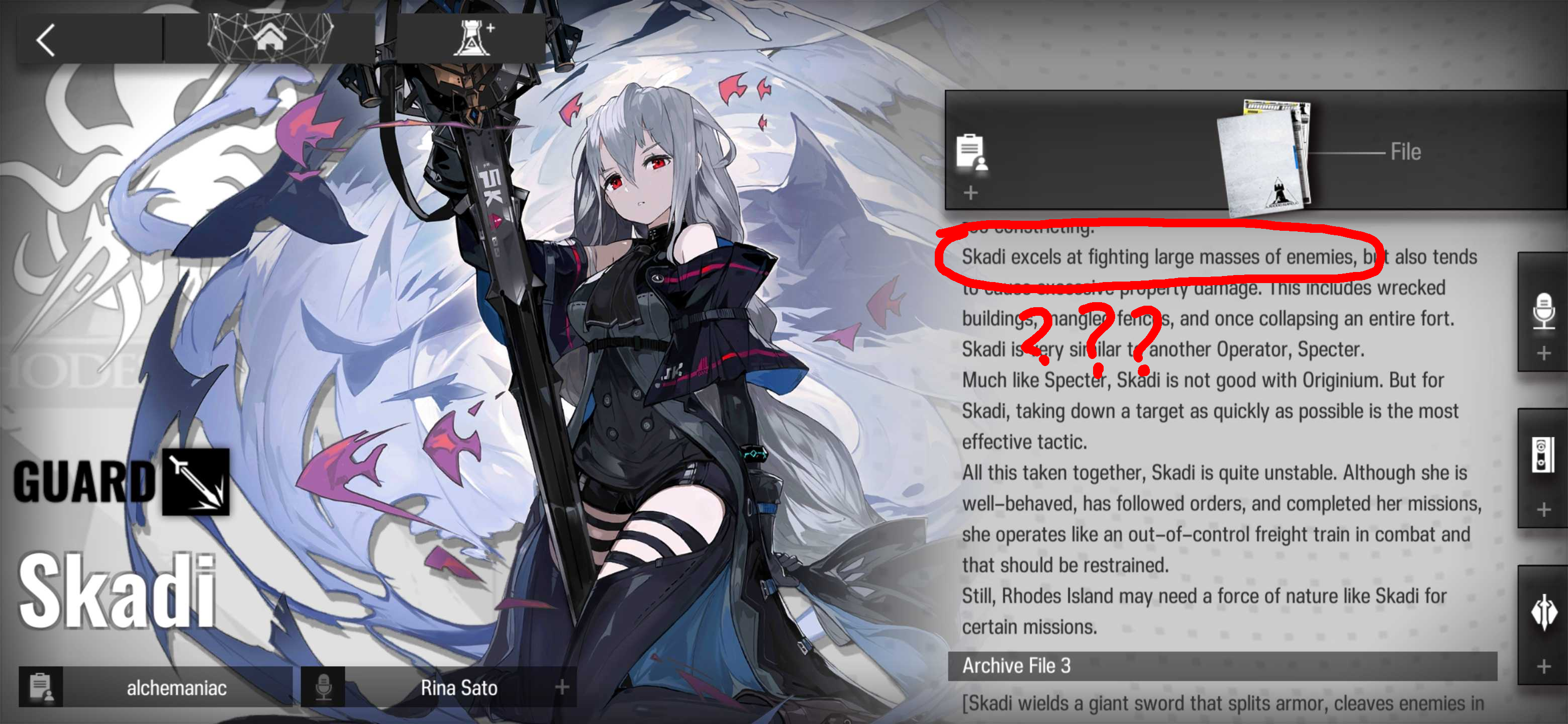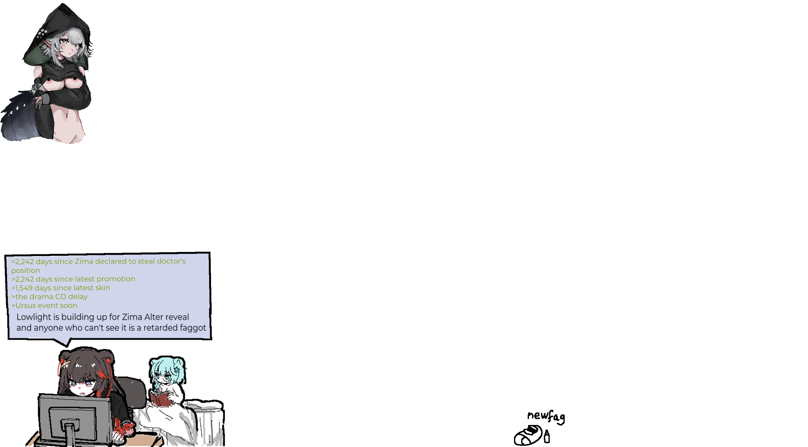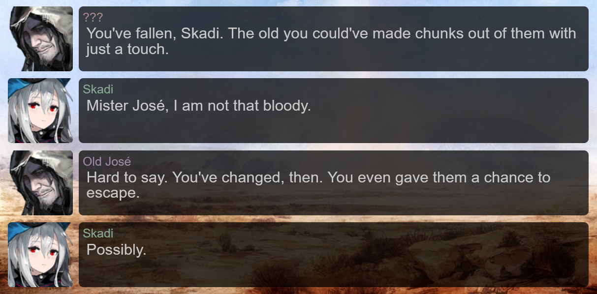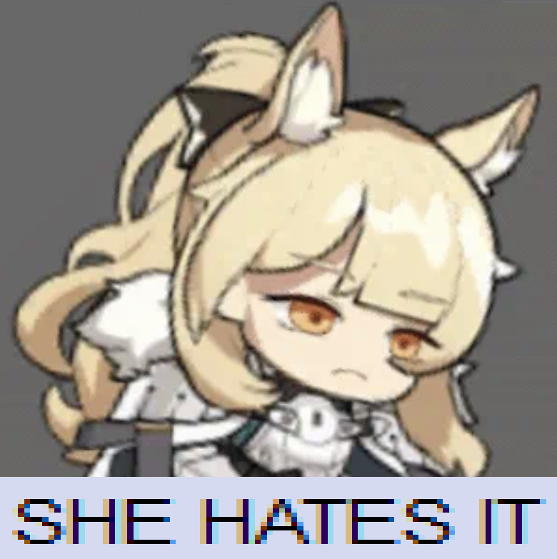 >>559643238She can be cute when she's relaxed and acts absentminded, but she's changed a lot over events. At the start of Arknights in her first event, I wouldn't call her cute. She was indifferent to most things and people, and basically powerwalked through things to get to her goals. Though it wasn't out of ill intent, she was trying to not get other people hurt since her previous friends and the people she knew suffered greatly and it seemed to happen to everyone she got in contact with per her land stay, the terrible memories always staying. As she gets used to land and meets reliable people like Kal, Specter again, and other old friends, she mellows out and has a bit of an awkward phase where she really wants to look out for them but also knows as Abyss Hunters they can't really expect to live tranquil lives. If it was up to her, she doesn't like complicating things and it extends to even her fighting and work ethic, but acts a bit sarcastic at times to pass off complicated moments. Now in present events she's working with a lot of people she can trust, but she's more determined to find out how to kill THAT Firstborn to precisely protect them even if it cost her own life, while before she was more confused and scared about the whole ordeal.>>559643265It's a grind optimizing experience, you can retry stages to get what you're missing. Ideally you nab the good ops from guarantees but roll with what you get, use the resource nodes and fulfill their conditionals to fill up the bars. You'll get mats over time with a proper setup, don't worry about rushing it.