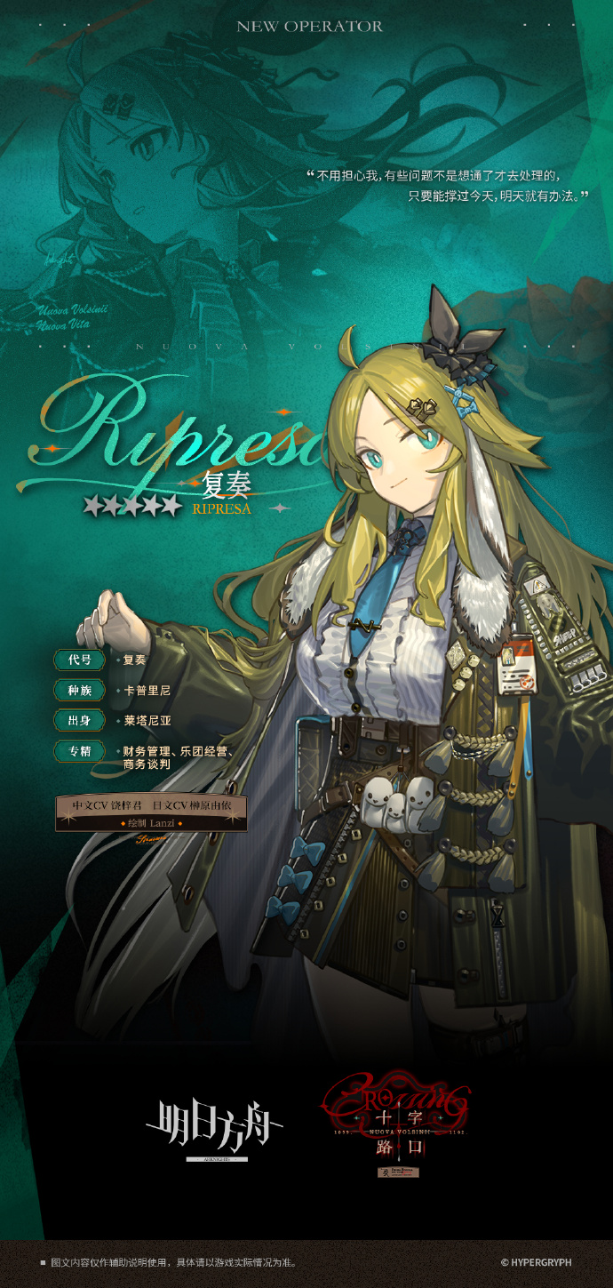 Previous thread: >>559552196Happy birthday to Skadi!>CURRENT, FUTURE GLOBAL/JP/KR CONTENT:[2/27-3/13][Standard]6* Sniper Fiammetta, 6* Defender Penance (Shop), 5* Vanguard Cantabile, 5* Specialist Spuria, 5* Caster Harmonie (Shop)[2/24-3/6]Ending a Grand Overture Rerun - Bobbing skin[3/6-3/27]Rebuilding Mandage - Puzzle skin[3/6-3/20][Orienteering Headhunting]6* Medic Mon3tr, 6* Caster Logos, 6* Guard Hoederer, 6* Specialist Ascalon, 6* Sniper Ray, 6* Specialist Thorns the Lodestar, 5* Specialist Figurino, 5* Specialist Tippi, 5* Caster Rockrock, 5* Vanguard Fang the Fire-Sharpened, 5* Specialist Almond, 5* Supporter Proviso[3/6-3/20][0011]Figurino[3/6-3/20][Skin reselling]Irene, Leizi, Kroos the Keen Glint, Coldshit; Wind Chimes>CURRENT, FUTURE CN CONTENT:[2/26-3/12][Standard]6* Specialist Swire the Elegant Wit, 6* Guard Degenbrecher (Shop), 5* Supporter Alanna, 5* Supporter Quercus, 5* Caster Aroma (Shop)[2/10-3/10][0011]Dusk, Ling, Yu, Philae, Surfer[2/24-3/17]Vector Breakthrough #2 - Greyy skin[2/24-3/10][EPOQUE Re-Edition]Viviana, Bagpipe, Matoimaru>/akg/ website:akgcc.github.io>AK EN Database:puppiizsunniiz.github.io/AN-EN-Tags/akhrchars.html>More valuable resources:rentry.org/akg_resources>/akg/ merch guiderentry.co/akg_merch