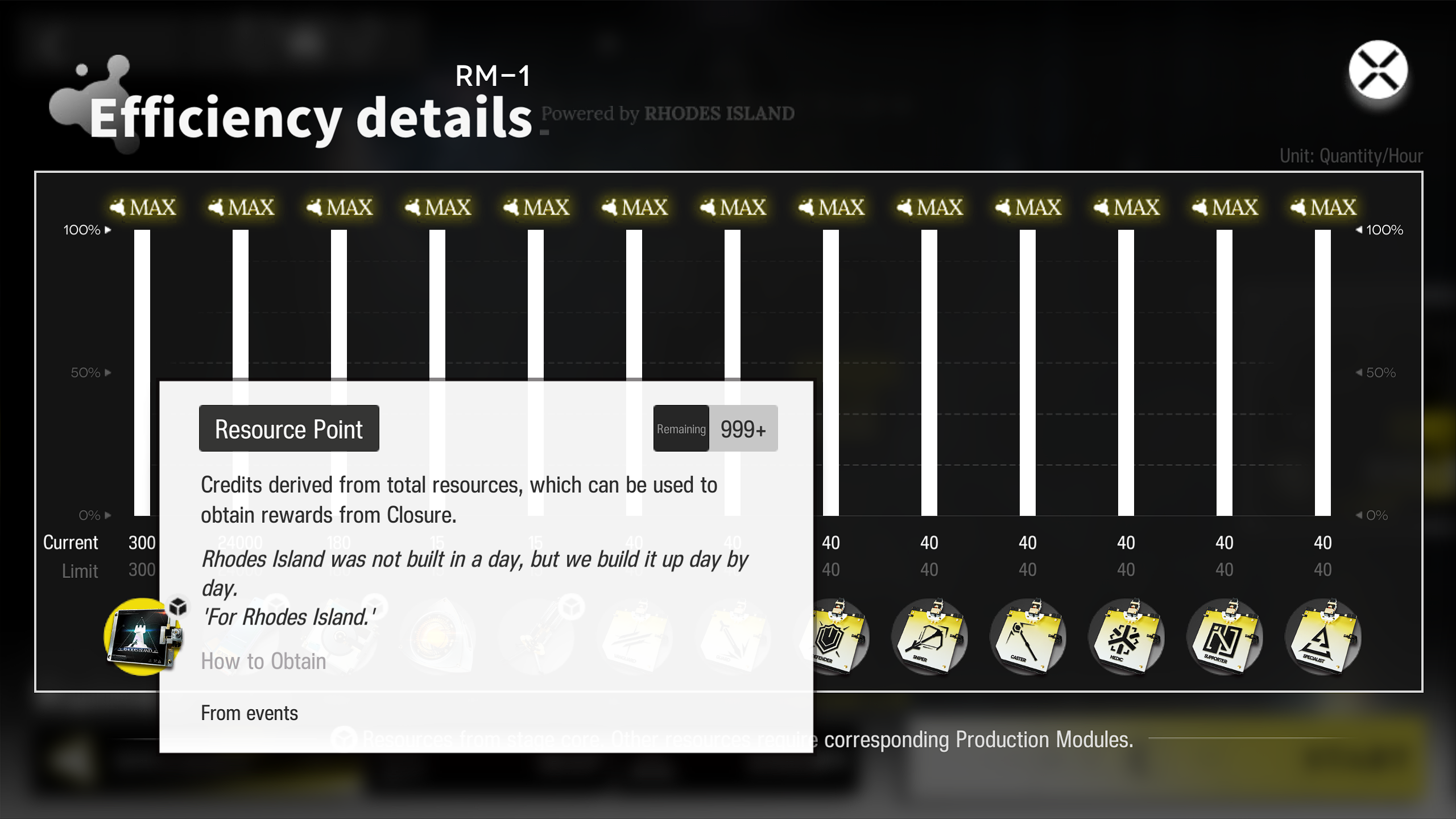 >>559643265You can rerun old stages as much as you want. Each time you do, you can choose to save the resources you generated to the stage. If you do, that many resources will be generated every hour passively.The most important resource is the leftmost one, the 'Resource Points'. This is what progresses you down the rewards tree. As long as you can max this resource out in the passive generation for all the stages you will easily get all the rewards for the event. Everything else is just stuff that helps you level up, skill up, promote, and recruit operators to make your squad stronger. Oh, and Strategic Beacons help you get more techs.