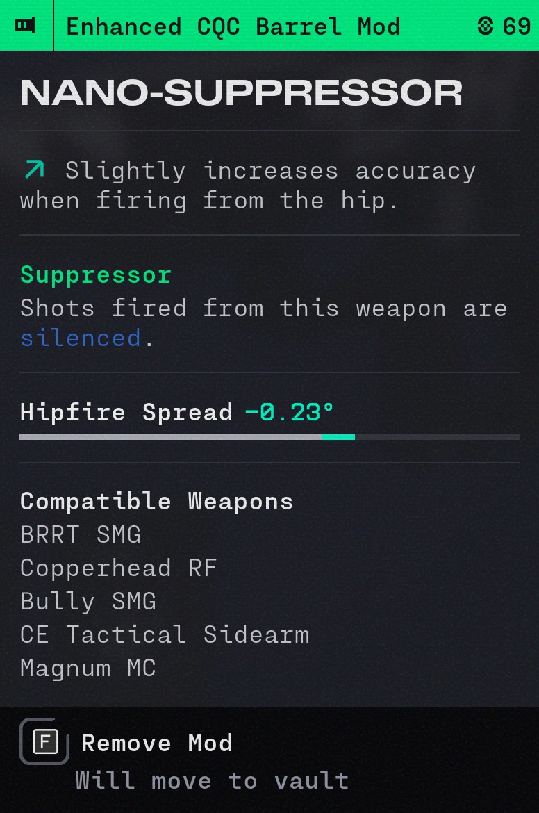 >>559613778There are silencers, I think I remember hearing that it lowers the range of audio generation down to like 20 or 30m. I feel like it fucks up the Bully somehow though, both times I've tried to use it I basically couldn't hurt other players, and I took this off a guy who lost a fight to me badly so I really don't trust them for anything other than PVE fights.The UESC themselves will still make a shitload of noise though, so enemy player can definitely still hear what you're doing.