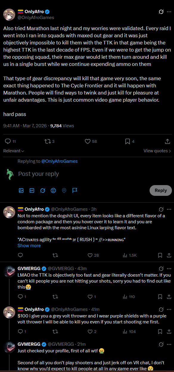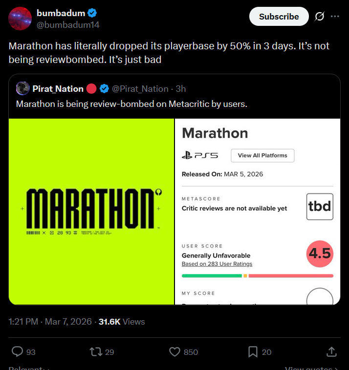 >>559641147It’s funny you mentioned Destiny’s launch because that game’s launch window was hard carried by all the goodwill and hype they had built up from Halo. It would have died otherwise. Comparatively speaking, Marathon is getting murdered in no small part because Bungle has spent the better part of this decade burning all goodwill and trust