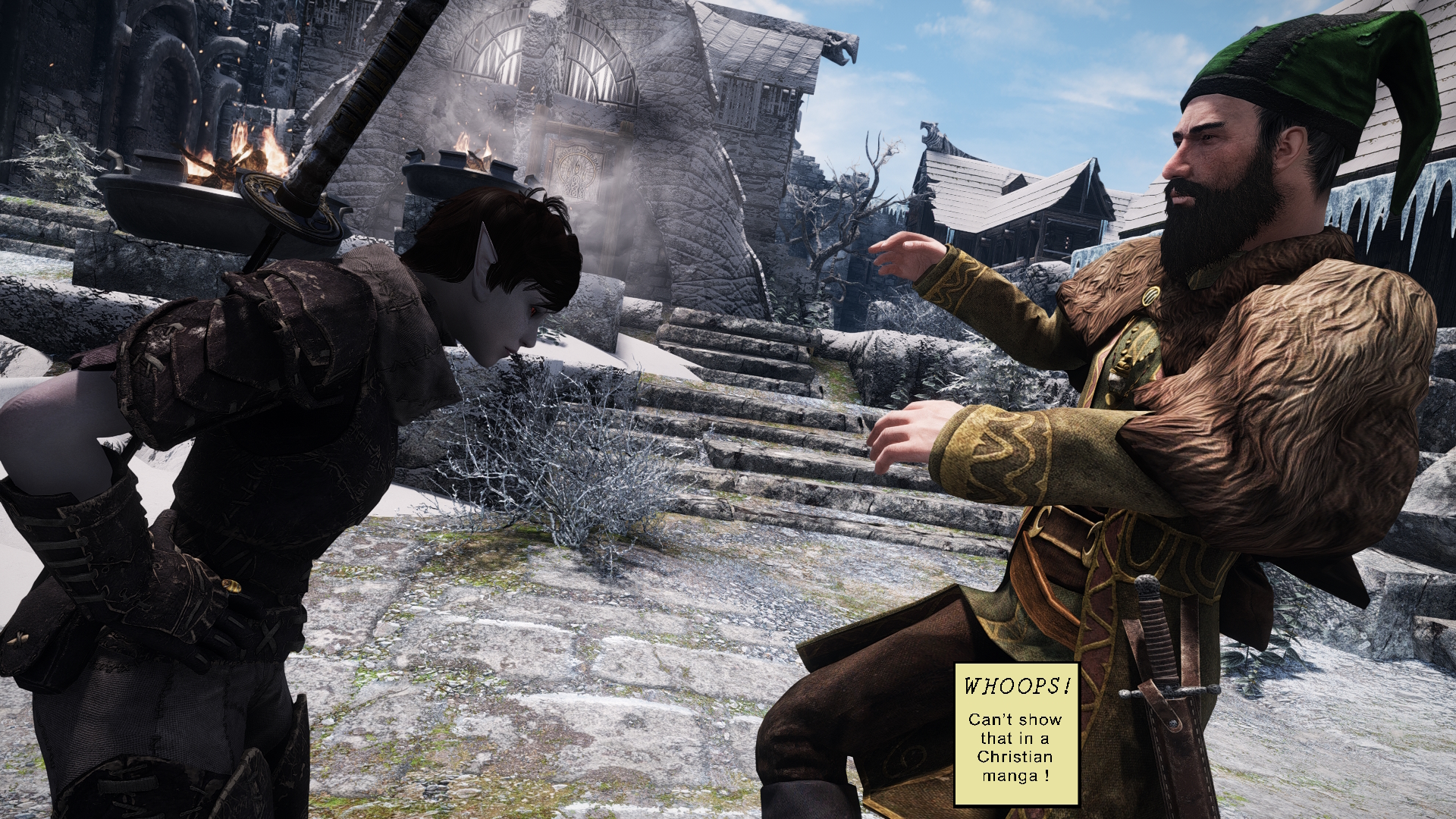 >>559619195Hmm yes, very amusing.>>559619198>a dirty hoboI'll have you know that's Torbjorn Shatter-Shield, patriarch of the wealthy and influential Shatter-Shield Clan. Right after I posted that screenshot, dynamic idles created this on their own.>>559619265Solstheim is great. It is pretty small though and of course the main quest depends on you being dragonborn and decently far along in the main quest on the mainland.