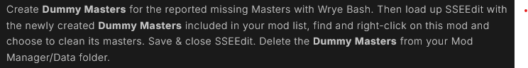 >>559702427Following this guys instructions, and it feels like I'm missing steps cause SSEEdit isn't saving anything when I right click & clean masters. It straight up tells me when I try to save afterward that no changes were made.