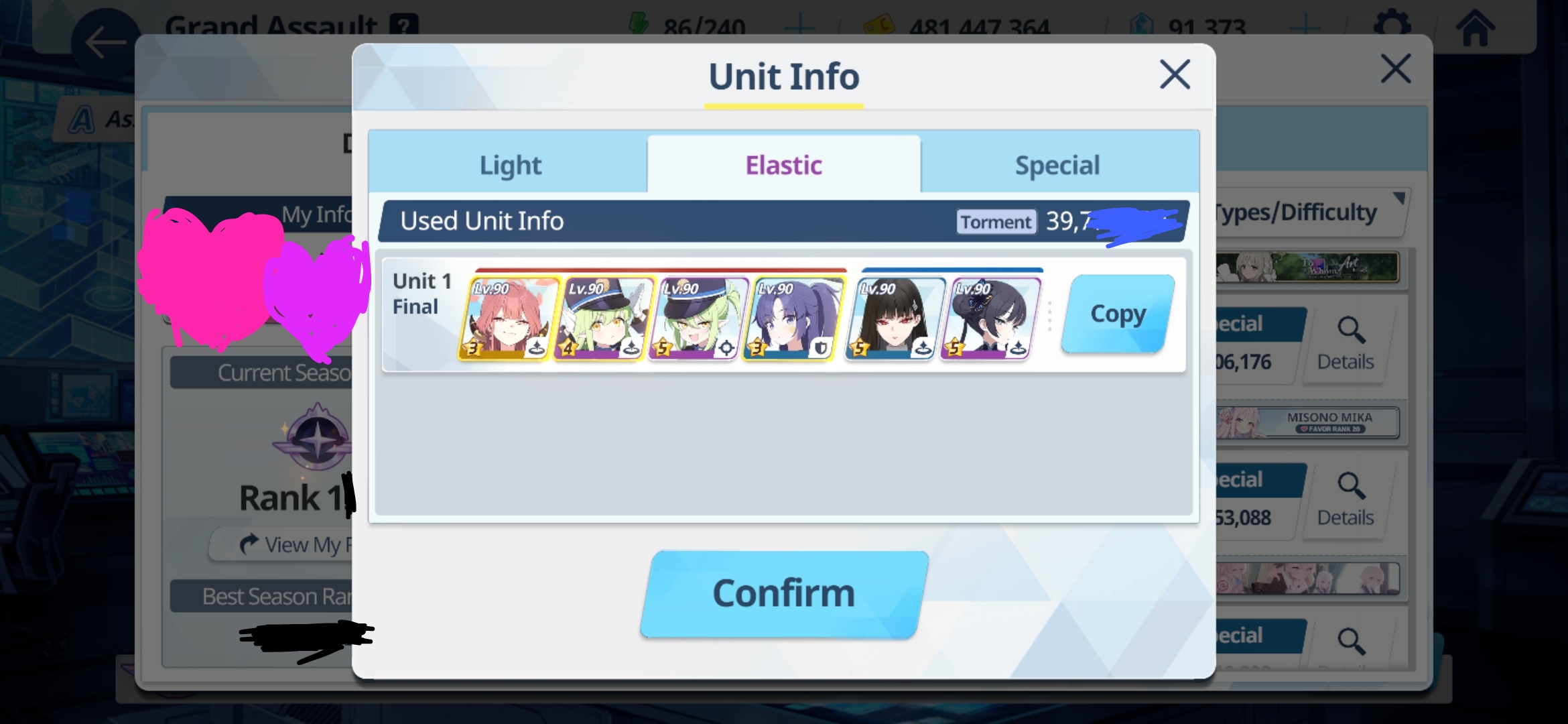 So purple torment is finally done. Burned through two attempts because reposition stuff sucks. I found a guide that had the placement of students where the only one I needed to move was hoshino in the kuro phase once per rotation which made that phases braindead. Torment red was easy no real issues. I don't like Shirokuro just because reposition is bad. I don't like it when I am one pixel off Nozomi runs straight in the middle lane to die.
