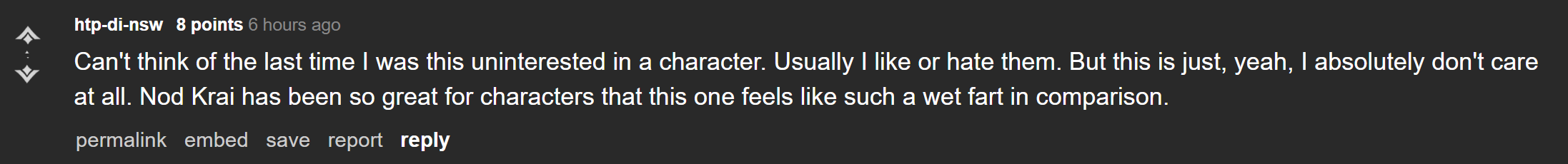 >>559714286Iirc, Varka was shitposted for two things: his shitty numbers and his bum/useless personality. I barely saw anyone in this thread saying they would genuinely don't pull Varka because of him being male, most were praising him for "looking like a real man" and appealing to male players. Besides Kazuha I don't remember any male being hated. Itto is hated now because he is just annoying but I don't know if he was hated at first. Ayato is just forgotten. I think Sumeru really fucked up the future of male characters forever because of Alhaitham situation. He went from "literally me" guy who could've been popular among male players to a purely fujo character because of Kaveh alone. I don't think if Kaveh didn't exist male players would hate him being meta.