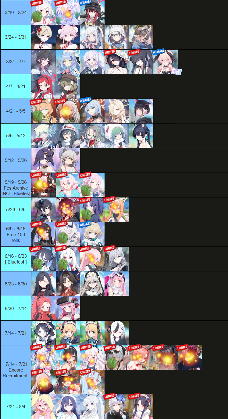 Previous Thread: >>559690967>Guides, Resources and useful links:https://rentry.org/bagguides>/bag/Circles/Clubs/Friends:https://rentry.org/holdingthebag>4koma, Manga, Side Content, PVs & Shortshttps://rentry.org/bacontent>>(JP) – JST>Banners:>3/4 After Maint – 3/18 10:59Koyuki (Pajamas)Yuuka (Pajamas)Noa (Pajamas)Fuuka (New Year – Limited)Haruna (New Year – Limited)>News:Patch notes: https://bluearchive.jp/news/newsJump/639>Events:Secret Midnight Party: The Chimes of Tag – 3/4 After Maint – 3/18 10:59>Content:Grand Assault: Hieronymus (Urban – Torment w/Heavy & Special Armor) – 3/4 After Maint – 3/11 3:59Limit Break Assault: The Fury of Set (Field – w/Special Armor) – 2/13 11:00 – 3/18 3:592x Lesson/Scrimmage – 3/4 4:00 – 3/11 3:592x Hard – 3/11 4:00 – 3/18 3:59>>(GLOBAL) – UTC>Banners:>3/3 2:00 – 3/10 1:59Hina (Swimsuit)Iori (Swimsuit)Mimori (Swimsuit)>News:Patch notes: https://forum.nexon.com/bluearchive-en/board_view?thread=3374459>Events:The Arius District's Emergency Class Mission – 2/3 2:00 – 3/10 1:59Balancing Schale's Books with the General Student Council – 3/3 2:00 – 3/10 18:59My Office: https://bluearchive.nexon.com/user/myoffice>Content:Grand Assault: ShiroKuro (Indoor – Torment w/Light & Elastic Armor) – 3/3 2:00 – 3/9 18:59Limit Break Assault: The Fury of Set (Field – w/Special Armor) – 2/11 2:00 – 3/9 18:592x Commissions – 3/2 19:00 – 3/9 18:592x Bounty – 3/9 19:00 – 3/16 18:592x Account EXP – 3/13 19:00 – 3/15 18:592x Commissions – 3/16 19:00 – 3/23 18:592x Account EXP – 3/20 19:00 – 3/22 18:592x Lesson/Scrimmage – 3/23 19:00 – 3/30 18:59