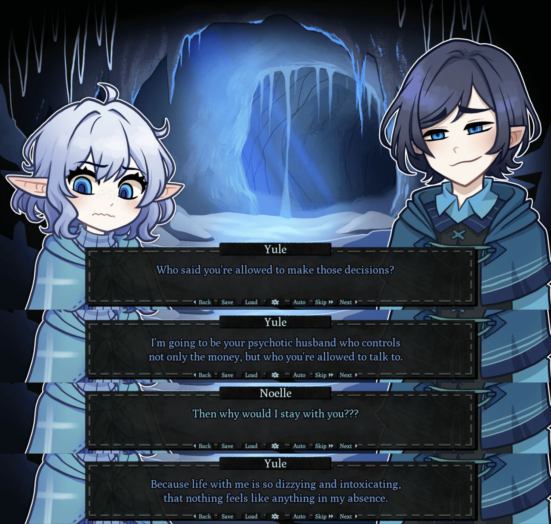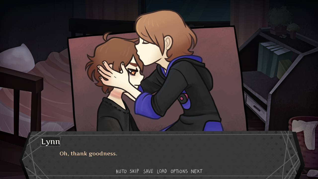 >>559749895The more I think about it, the more I'm confident that there will not be a marriage ending. The game already flirts with that by giving you a wedding ring and letting you choose it to influence an outcome. I know that in Cliffhanger, the ring doesn't play (yet), and we have no idea how Burial will go. But would, Nemlei "double dip" a theme like that? Frankly, I don't think so. I think Nemlei takes pride in how disparate the different routes are. Your choices are meaningful and send our characters on very different paths. So I think Nemlei played the marriage card already. For my money, I think SnS is the only ending where there is any kind of ring