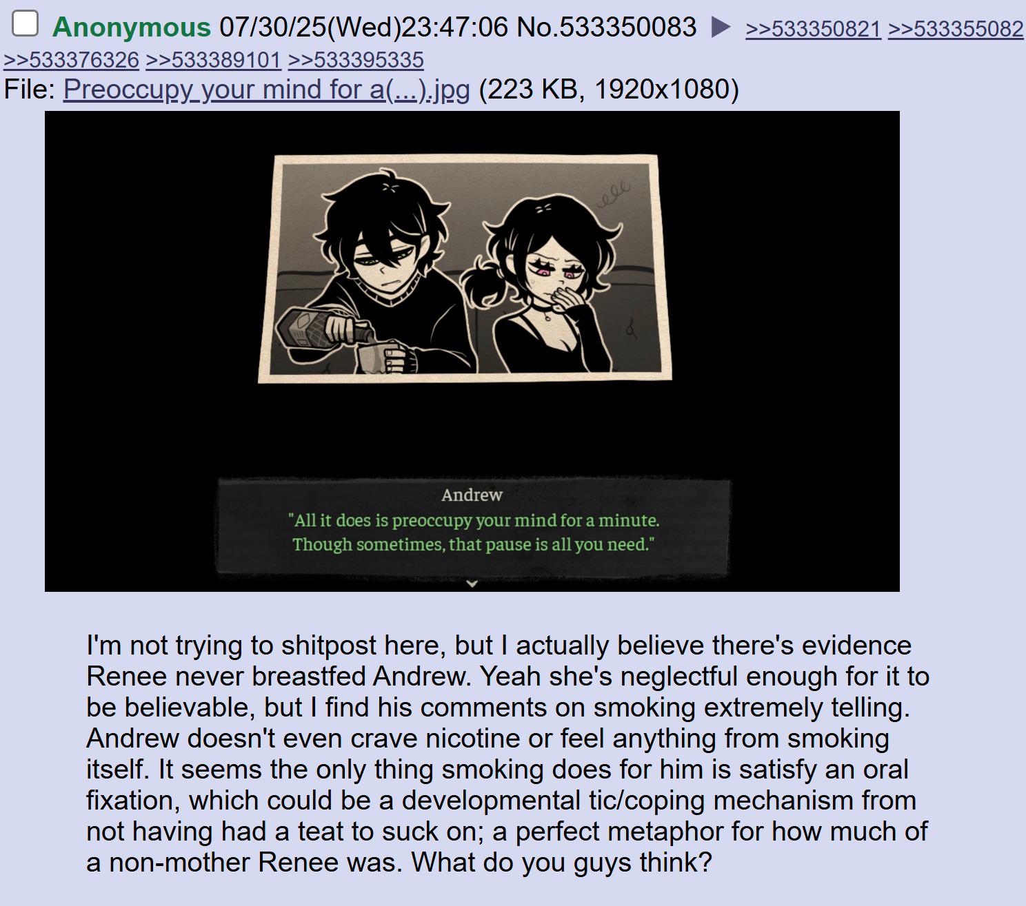 I've been jerking off to this game so much that I'm afraid to replay it out of fear that the pornography I've been consuming has altered my perception of the characters