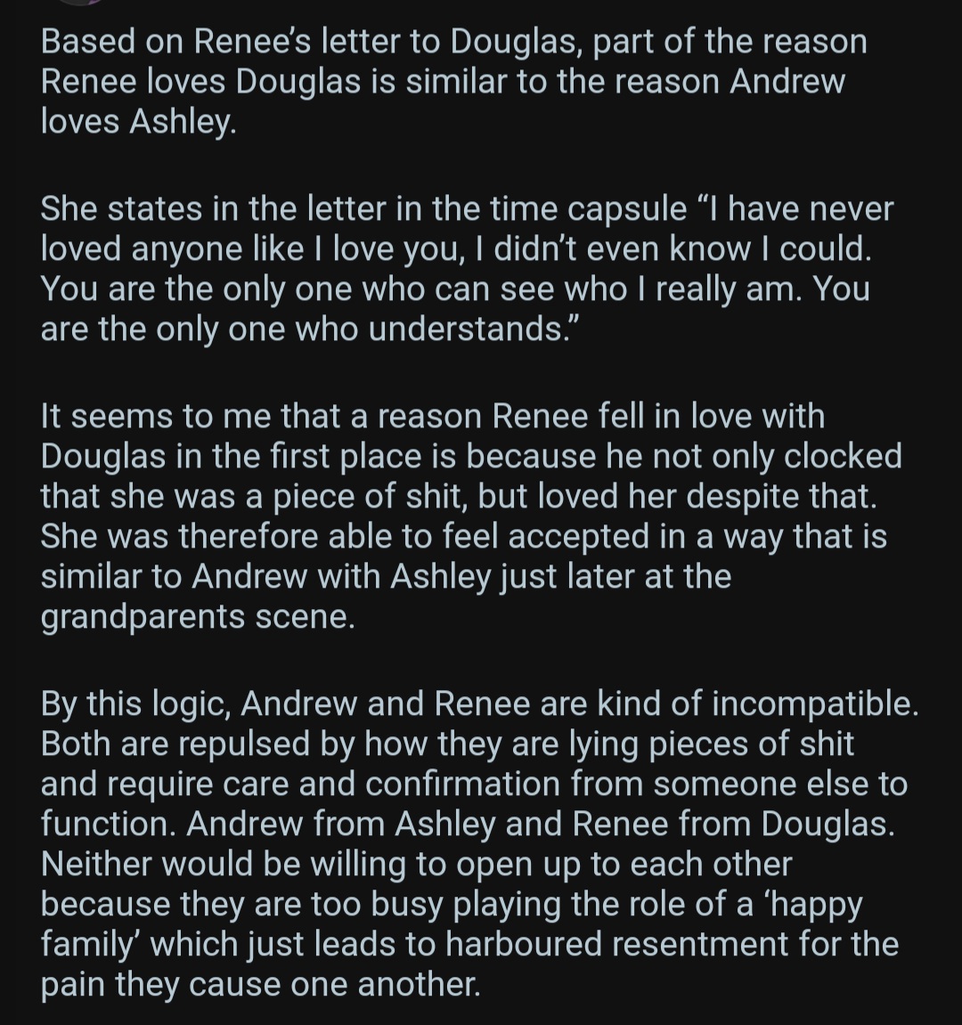 >>559729390gotta thank her though because if she was a good parent, andy and ashley wouldn't be co-dependent