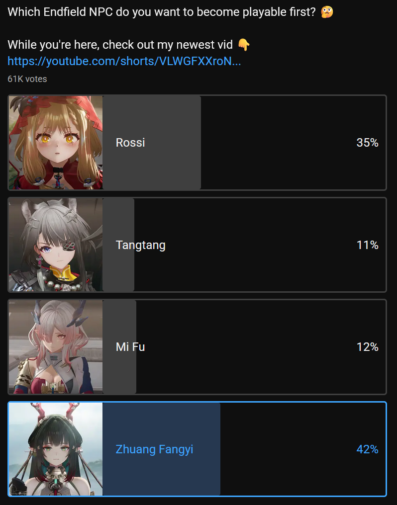 Previous thread: >>559707173>Old Deep Water Dies, by Rising Tide It is Deniedhttps://youtu.be/AtoOV6q7LnU - Version Trailerhttps://youtu.be/eKTskrTBZxU - Dev Log Stream>Official Websitehttps://endfield.gryphline.com/en-us>Official EN X - Newshttps://x.com/AKEndfield>DEV Comm - Developer Updateshttps://endfield.gryphline.com/en-us/news/3846>Yvonne PVshttps://youtu.be/1mTQW3rAMXchttps://youtu.be/rDmr6zDPEawhttps://youtu.be/xqSHlK8kAKI>Chartered Headhunting ScheduleFebruary 24th to March 12th Hues of Passion, YvonneMarch 12th to March 29th River's Daughter, TangtangMarch 29th to April 14th Wolf Pearl, Rossi>Reward CodesENDFIELDGIFTENDFIELD4PC>Twitch Dropshttps://endfield.gryphline.com/special/third-party-binding?channel=twitch>Wikishttps://wiki.skport.com/endfield (Official)https://perlica.moehttps://warfarin.wiki/enhttps://endfield.wiki.gg/>Blueprint Guideshttps://talospioneers.com/en>Stickershttps://drive.google.com/drive/folders/13KH3L6QPIKkVH7pBddv4uxwmwJsnOtklhttps://drive.google.com/drive/folders/1OuVtjv1k-9c3M6n7d4PX3CGG5bkwH04ahttps://drive.google.com/drive/folders/1AStB8bzFk3lSwMwczWPkFYCBrZe0vHOghttps://drive.google.com/drive/folders/1yS0lqUhxf8tBRtpDFfCU1y16IS2sSeF7>Fri/end/sSubmit your info, /end/min:https://forms.gle/Fo7BhZMKaKqiWyL19View other /end/mins:https://docs.google.com/spreadsheets/d/1YtxiDss0hgEQhLlZgpfzyGrJrzUcqDzOS9T6IH-BiVc/edit?usp=sharing