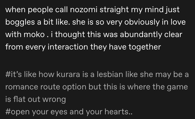 nozomi probably isn't straight but how'd they come to the conclusion that she was in love with moko of all characters