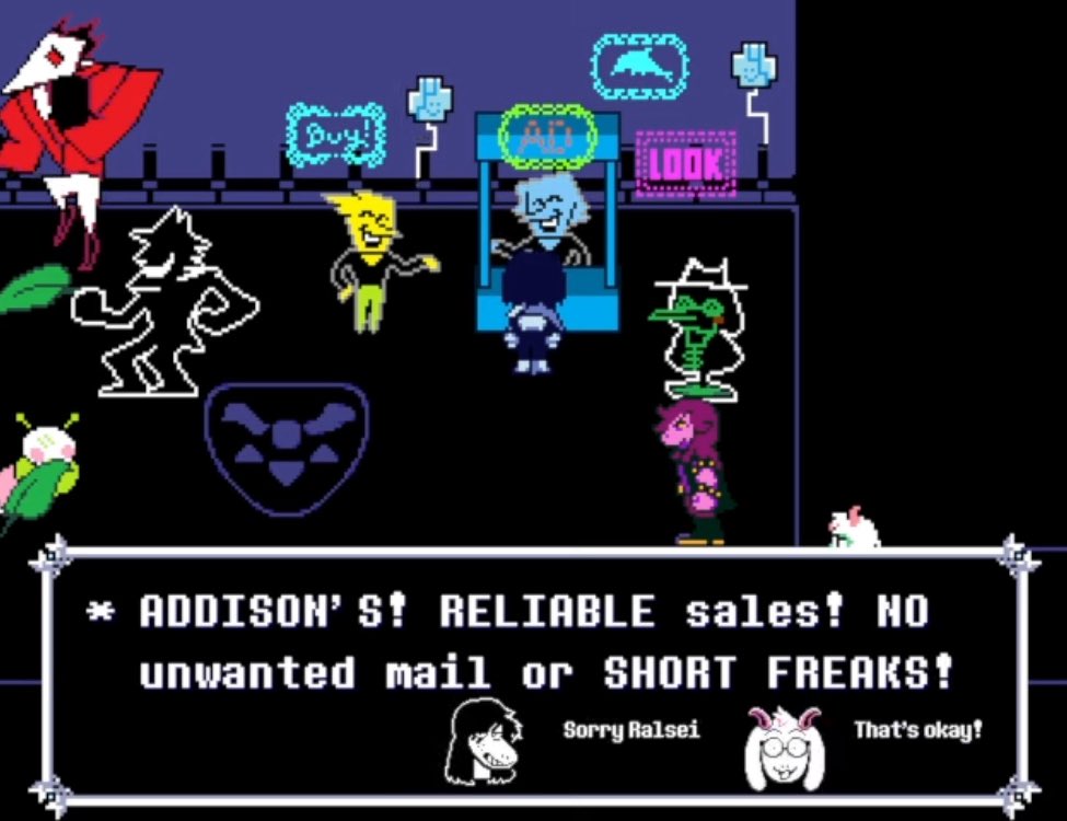 >>559765858Notice how the blue addison, who was hc'd by the fandom to be the one addison who cared about spamton, actively despises spamton in canon while the pink addison, who was hc'd to really hate spamton, is the one addison who secretly cares about spamton and almost brings him up in his castle town dialogue before staying quiet about it