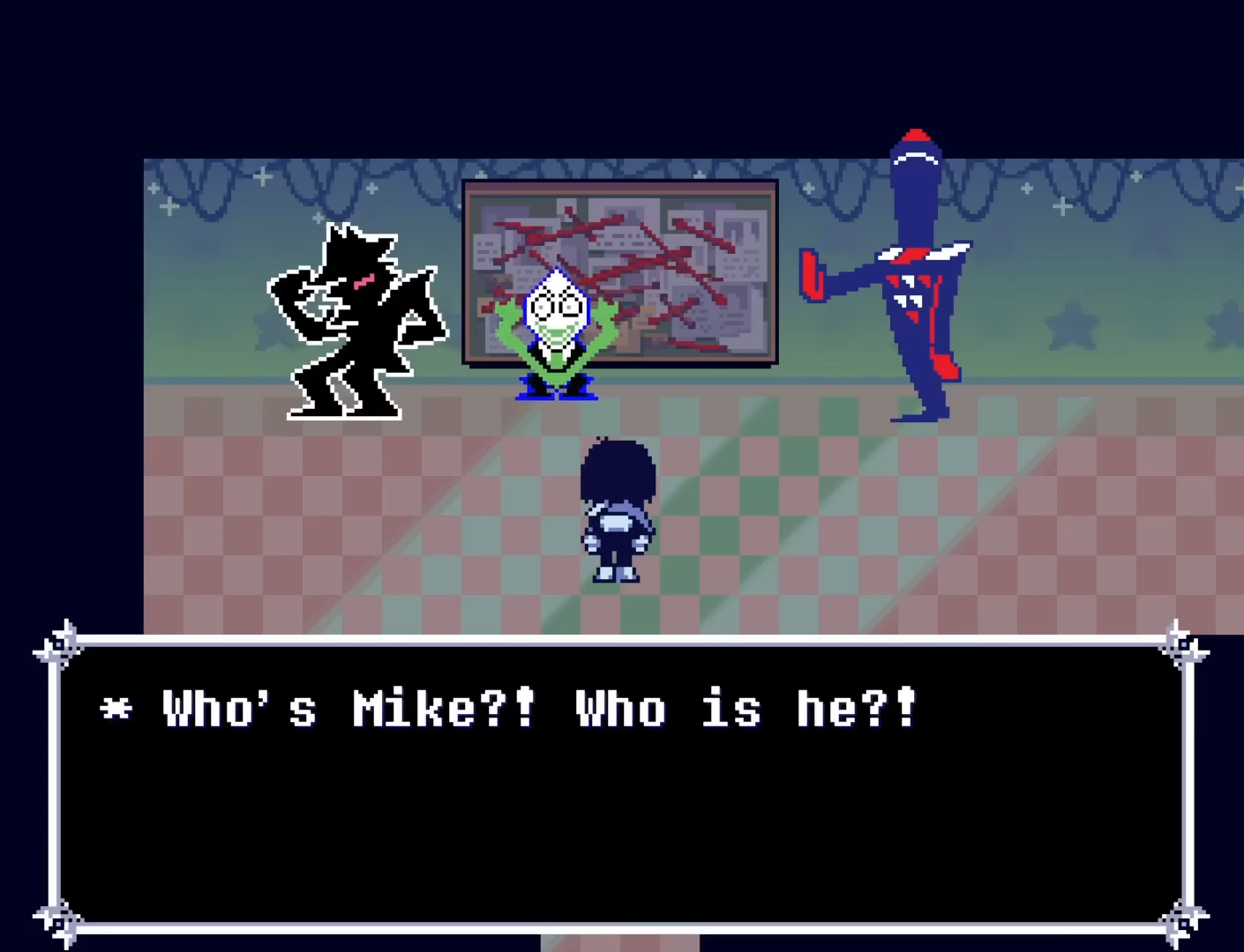 >>559767428Kris' dark world (tv world) is pretty different through, its main colours are red and green, it has divorce as a main topic to the point where even spamton is affected by kris DW's darkness and goes from his chapter 2 era "grr dont trust mike and damn you tenna" to being all about hating tenna in the gayest way possible, not to mention how the darkners are generally less aggressive than the knight's dark world and susie's dark sanctuary dark world (in the second sanctuary even the npcs become enemies sometimes)