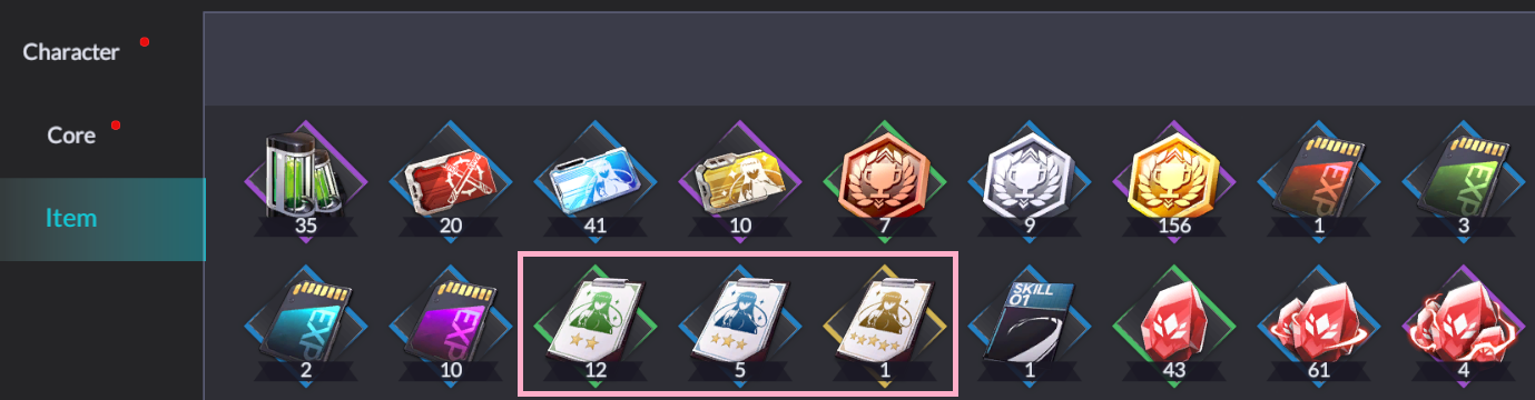 The 3 cards in the pink box. From our dailies, 2 are consistently "25 energy + mystery box." The mystery box can deliver both 1x of the Green/"Stand in for 2-star fodder to make something 3-star" and 1x of the Blue/"Stand in for 3-star fodder to make something 4-star."