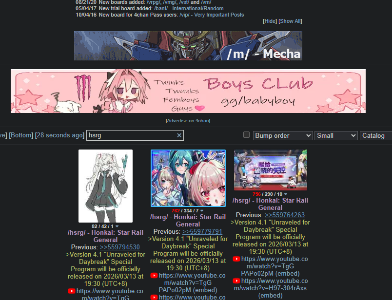Previous: >>559794530>Version 4.1 "Unraveled for Daybreak" Special Program will be officially released on 2026/03/13 at 19:30 (UTC+8)https://www.youtube.com/watch?v=TgGPAPo02pM https://www.youtube.com/watch?v=H97-304rAxs >Download - https://hsr.hoyoverse.com/en-us/home>4.0 Preview Page - https://act.hoyoverse.com/sr/event/e20260206version-nwlbwa/index.html>Version 4.0 Trailer: "No Aha at Full Moon"https://www.youtube.com/watch?v=2hH0hILcWPshttps://www.youtube.com/watch?v=EMT6GmhDiBk >Sparxie Character Trailer: "Ravings"https://www.youtube.com/watch?v=NU6J88t4luM https://www.youtube.com/watch?v=AdUoc-nSB94 >I'll Never Forgive Star Railhttps://www.youtube.com/watch?v=7ia3b_9-znQ https://www.youtube.com/watch?v=gI-W8r-TWUM >Current Character Banners: Sparxie, Yao Guang, Cerydra, Rappa, Sparkle + Pela, Hanya, Qingque - https://www.hoyolab.com/article/44017918>New Drip Marketing:>Ashveil (5* Lightning Hunt) - https://www.hoyolab.com/article/43666646>Redeemable Codes - https://hsr.hoyoverse.com/gift4T28RJM4MS3BSub2SparxieMH5KCBGF3AAT45QSTARRAILGIFT>/hsrg/ Tools & Resourceshttps://rentry.org/hsrg-resources-14>/hsrg/ Thread Templatehttps://rentry.org/hsrg-thread-template-14