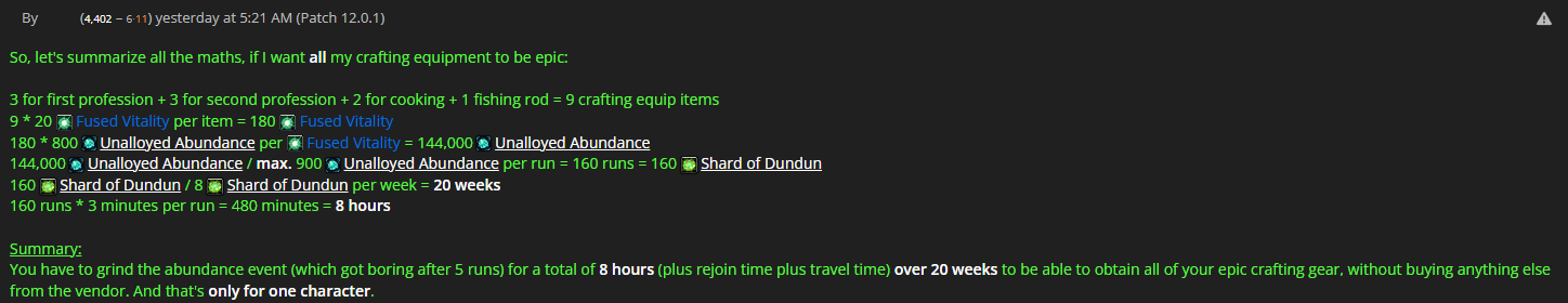 Am I the only one tired of dragonflying? Give me an entire expansion with revamped ground mounts like the undermine carts and I'll eat it up. Zones feel way too big to accommodate for fast flying mounts. Small zones with lots of population everywhere felt great(undermine)