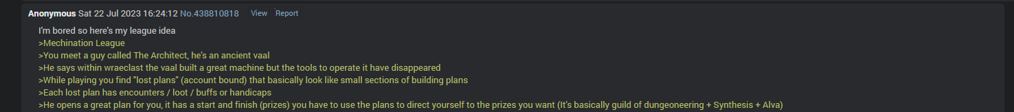 >>559906558>We all loved new content like Sanctum and Ancestor league.I unironically liked Sanctum and Ancestor, even though Ancestor was mechanically fucked balance-wise. It is weird that everyone seems to hate sanctum now though, even when it used to print currency. People don't really hold the same high opinion for Delve that they used to either. What new content do people even want anyway? How many new ways can GGG re-invent "spawn monsters in a circle" to keep people happy?