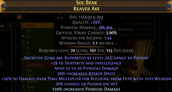 >>559916510I'm trying to do the raw currency stronboxes one. Seems to be the most popular so I picked it because I assumed there would be good guides on it (there weren't)Besides that I like Betrayal. I did some breaches but its kinda boring. Tried essences too but couldn't get much of anything from those rares