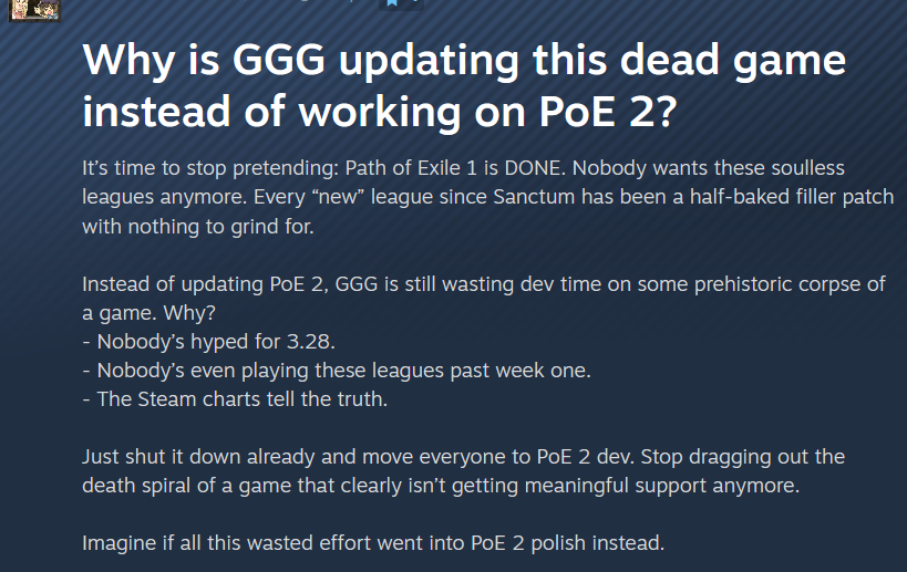 >>559912284for all intents and purposes, poe 1 is in maintenance mode. It gets like one post-release update per league and all the assets for each league are just reused from poe 2. It's basically a testing ground for poe 2 and a way to keep people sated while they work on bigger poe 2 leagues.