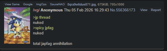 >>559856936>>559857225They hated him because he told them the truth. Japs just can't into Sonic.>>559857215You getting mad about it is definitely more autistic lmao, Japs never figured anything out with this franchise, and they know it, because you never see "Nicky" or "Tania" in the games these days either. Genesis Sonic IS Western Sonic. The Sonic weebfags worship is a newfag retcon with nothing in common with "Nicky."