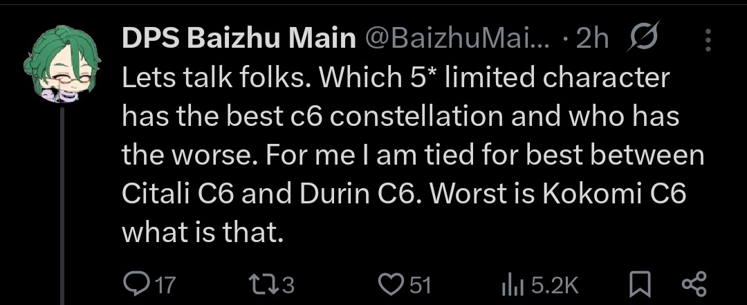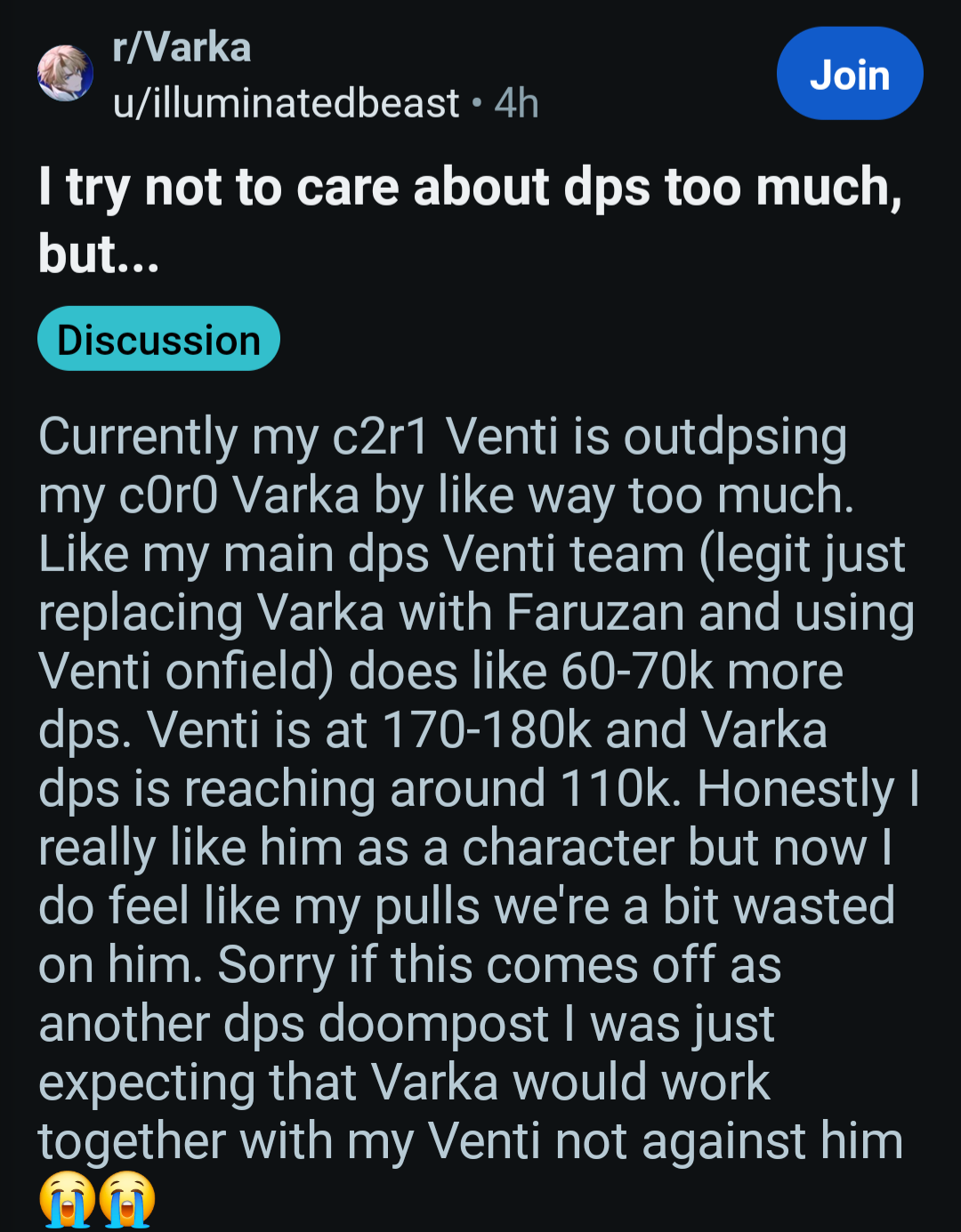 >Venti just got buffed, it would be ridiculous if he didn't outdps a C0R0. Why are you reposting reddit shitposts anyway?If you laugh you go to hell
